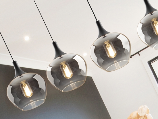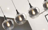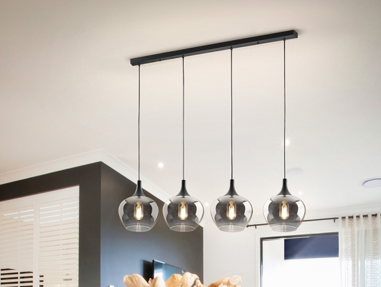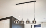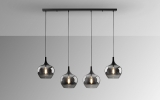 Подвесной светильник Opaz арт. 614245 с четырьмя большими каплевидными плафонами из зеркально- дымчатого стекла. Потолочное основание- прямоугольная планка с отделкой матового черного цвета. Высоту подвешивания каждого подвеса диаметром 19 см можно по желанию регулировать. Лампочки: 4 шт E27 LED max 20W.