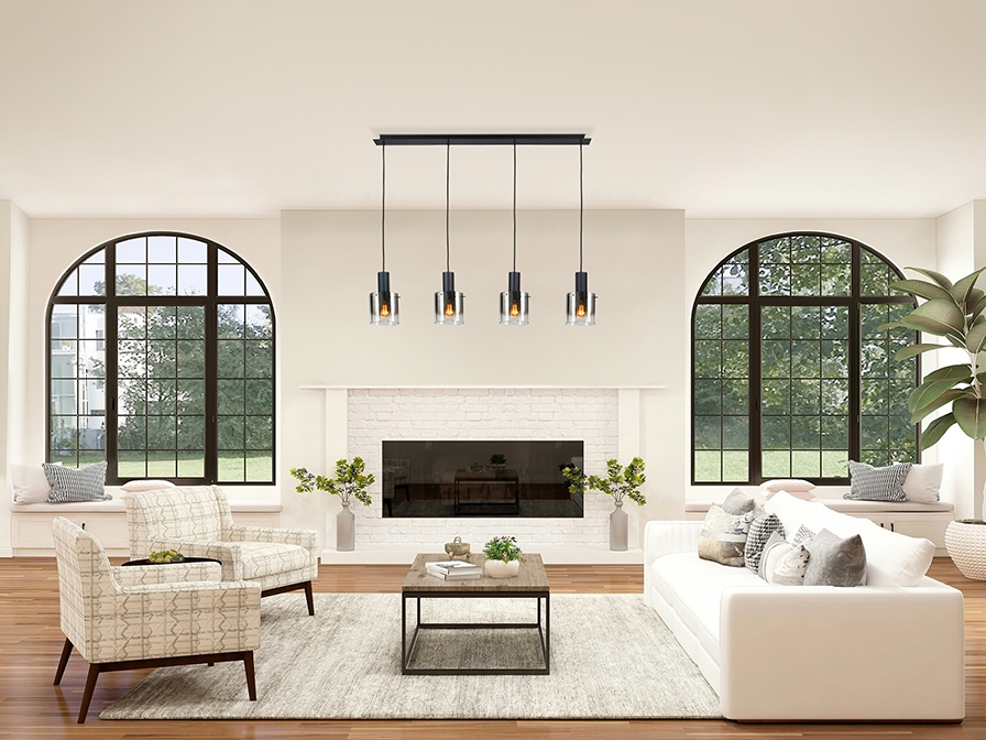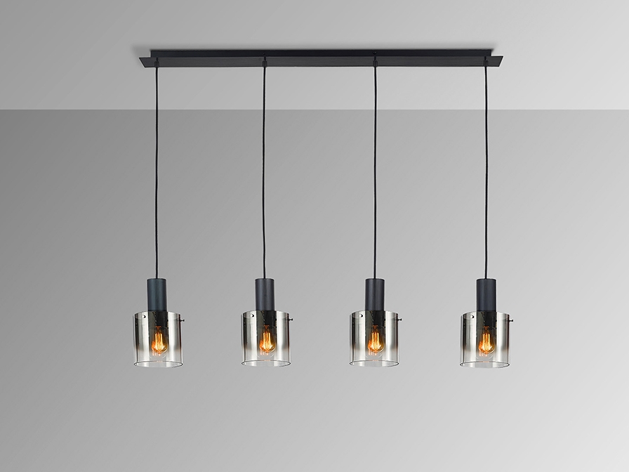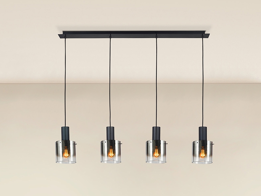 Стильный подвесной светильник Venize в чёрном цвете изготовлен из металла, окрашенного в матовый цвет. 4 цилиндрических плафона диаметром 15 см из зеркального стекла с акцентной отделкой металлическими деталями- держателями. Кабель черный текстильный регулируется по высоте у каждого подвеса. Модель одинаково интересна в разных помещениях интерьеров лофт и неоклассика. Новинка каталога Schuller в 2025 году. Лампочки с патроном E27 4 шт Е27 максимум по 20 W. Размеры основания для крепления (отверстие для крепления): 108х 2,5х 5,5 см