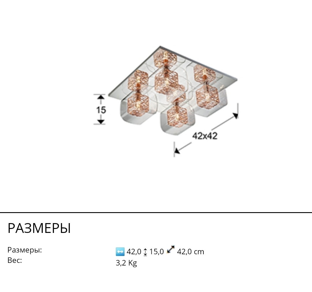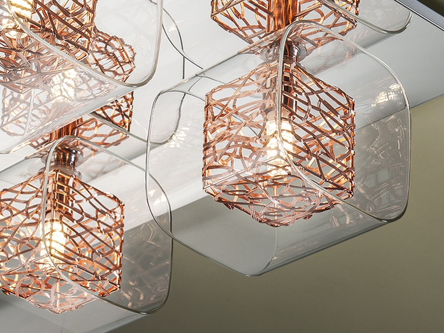 Потолочный светильник Lios с 4 оригинальными квадратными плафонами. Внешние сделаны из прозрачного формованного стекла, внутренние в виде кубика из медной проволоки. Лампочки 4 шт с цоколем G9 LED 6W входят в комплект.