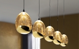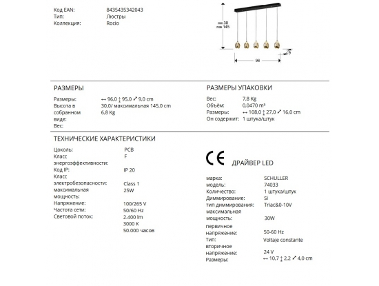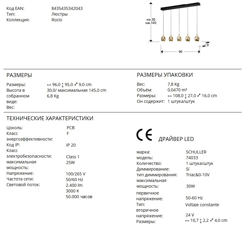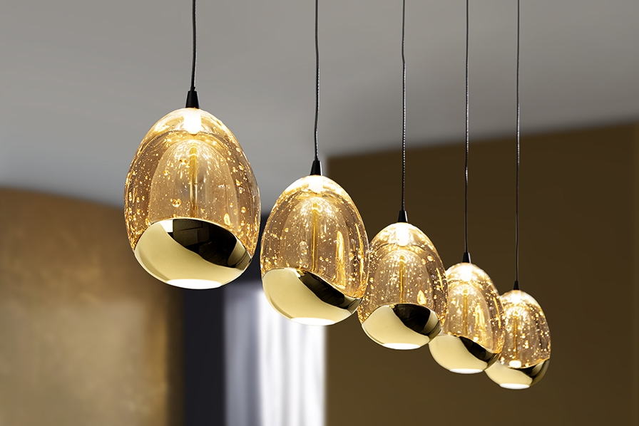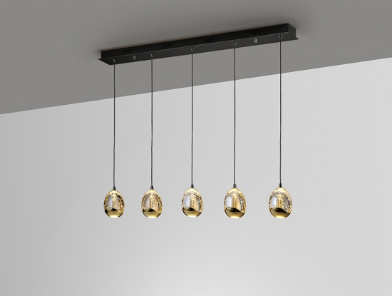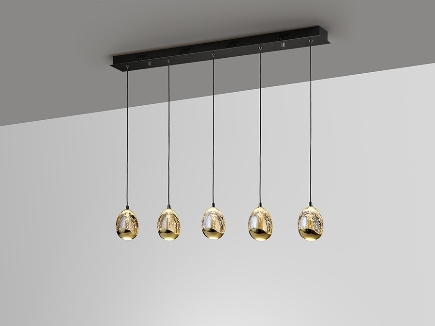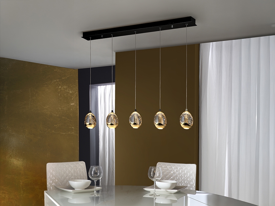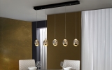 Светодиодный светильник Rocio арт. 783644 с пятью каплевидными стеклянными подвесами на прямой направляющей черного матового цвета. Массивное стекло с янтарным оттенком наполнено многочисленными пузырьками воздуха, интересно бликующими при включении света в помещении. Золотой глянец в отделке плафонов красиво контрастирует с черным цветом. Высота каждого подвеса регулируется по желанию от 30 см до 145 см. При включении свет направлен и вверх, и вниз изнутри подвеса. Световой поток: 25W LED, 2400 lm, 3000 K теплый свет.