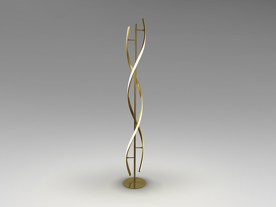 Интересный, словно, витой из двух золотых волн светодиодный торшер из новой коллекции светильников Dido. Узкий, диаметром всего 22 см и высотой 155 см. Отличный вариант для небольших современных комнат. Основание из стали, волны из легкого алюминия. По контуру расположен силиконовый рассеиватель опалового цвета. Световой поток: 45W LED, 2900 lm, теплый свет 3000K. Средний срок службы рассчитан на 50000 часов.