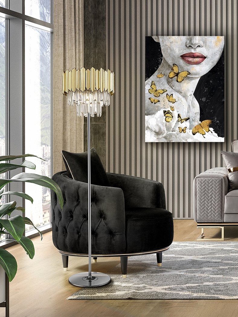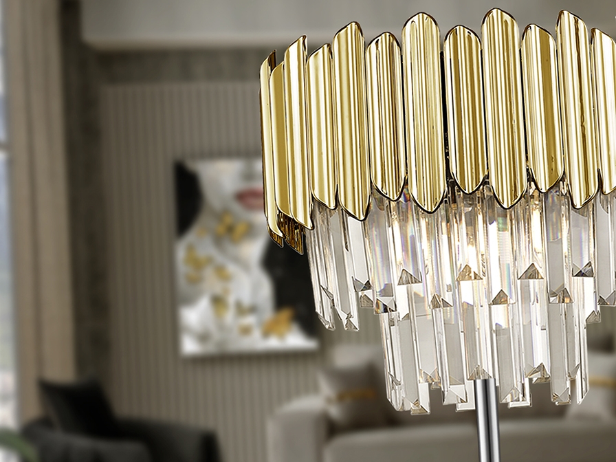 Современный торшер из коллекции Tiara арт.605021 с прямой тонкой хромированной ножкой и эффектным абажуром, образованным стеклянными прозрачными подвесками в форме каскада ниспадающих призм в обрамлении пластин из Abs пластика золотого цвета.