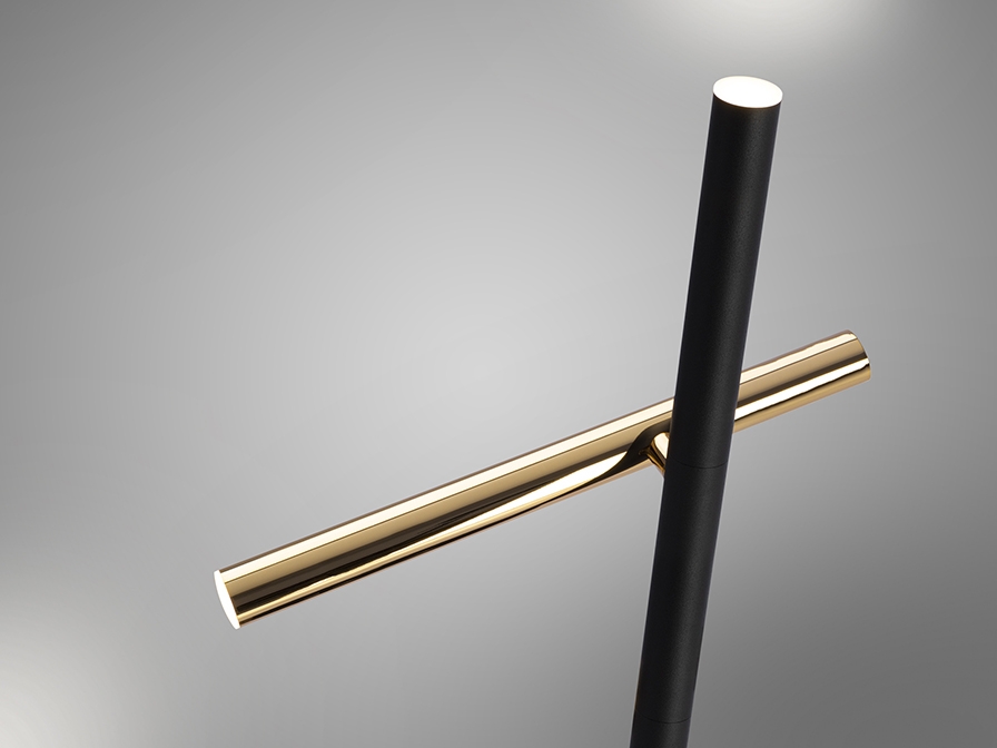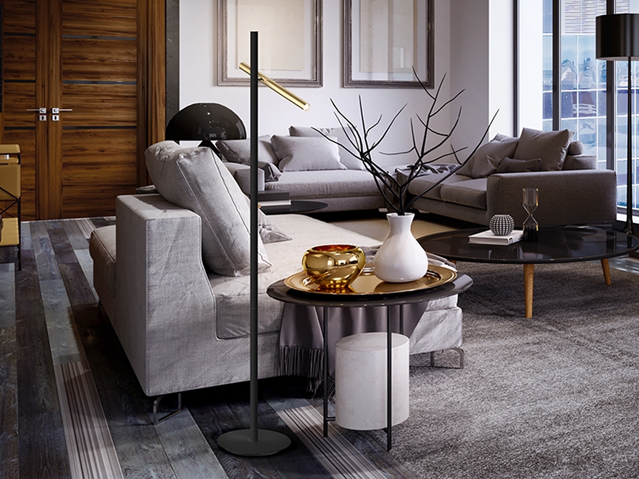 Современный минималистичный торшер- трубка из коллекции светодиодных светильников Varas. Отделка чёрная матовая сочетается с золотым глянцем на плафоне. Напольное основание круглое. Всего 2 источника света с акриловыми рассеивателями опaлового цвета на концах трубок. Световой поток: 10W LED, 900 Lm, теплый свет 3000 K.
