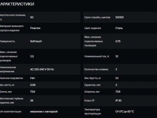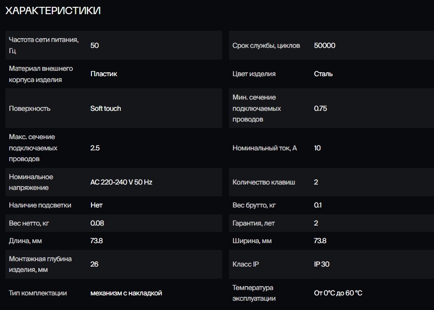 Стильный двухклавишный выключатель серии Voltum S70. Его высота и ширина- 71 мм. Изготовлен из негорючего и устойчивого к ультрафиолету поликарбоната с поверхностью Soft touch. Диагональные отверстия суппорта предназначены для удобного крепления механизмов в нестандартных условиях, не требующих применения подрозетников. Механизм самозажима в выключателях надежно соединяет провод с клеммой без помощи специальных инструментов, благодаря чему монтаж не занимает много времени. Срок службы: 50000 циклов.