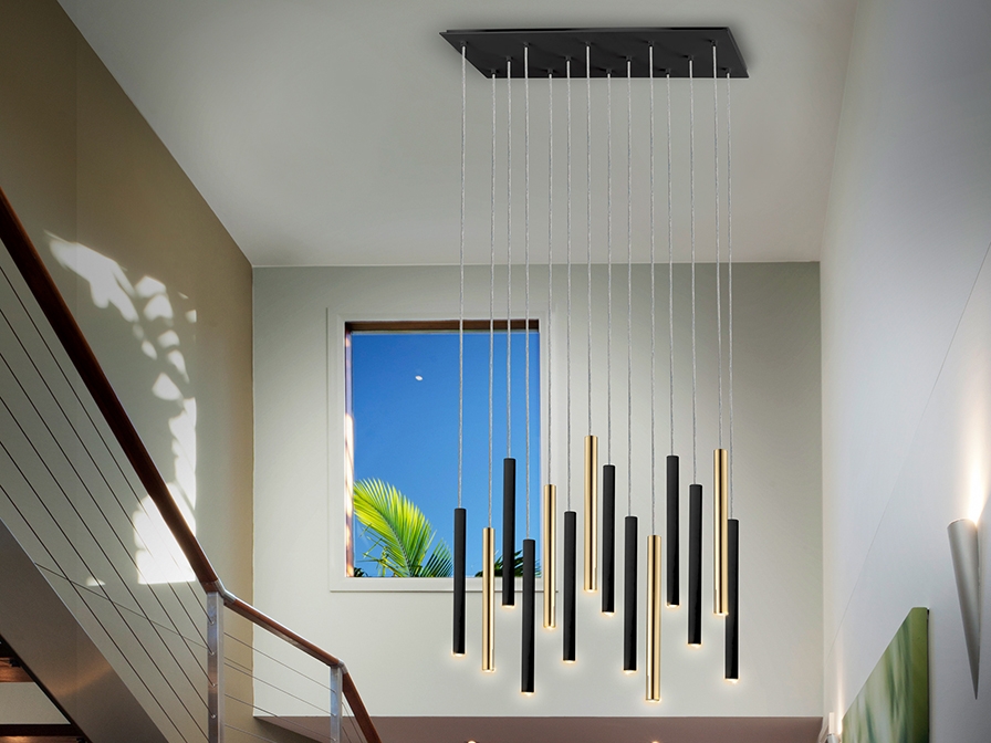 Высокий с удлиненными тросами подвесной светодиодный светильник из коллекции Varas с 14 подвесами- трубками из металла. Покрытие двух цветов: золотой и матовый чёрный. Потолочная база также матово- чёрная. Внизу каждая трубка завершается акриловым рассеивателем опaлового цвета. Световые данные люстры: 70W LED, 6300 Lm, теплый свет 3000 K, средний срок службы рассчитан на 50 000 часов. Максимальная высота достигает 300 см, открывая возможность для оформления высоких потолков в загородных домах. При желании можно подтянуть тросы для создания новой композиции из подвесов.