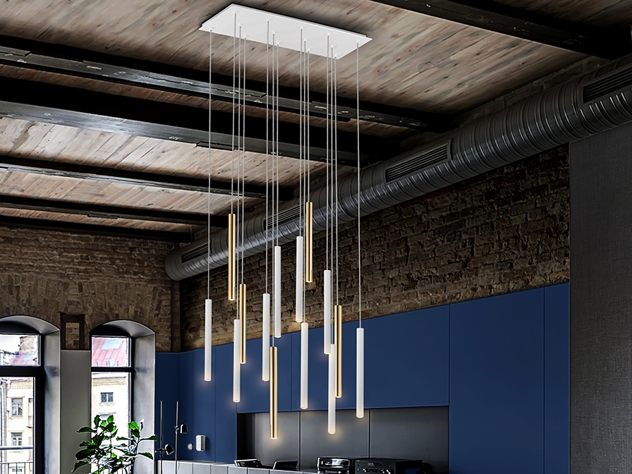 Белый прямоугольный потолочный светильник из коллекции Varas. Каскад образован из четырнадцати подвесов- трубок диаметром 3 см двух цветов: глянцевое золото и матовый белый. Современная модель с возможностью регулировки общей высоты до 300 см в интерьерах с высокими потолками. 70W LED, 6300 lm, теплый свет 3000 K. Коэффициент мощности: >0,90. CRI: >80. Внизу каждого подвеса акриловый рассеиватель опaлового цвета. Средний срок службы рассчитан на 50 000 часов. Кабель прозрачный. Диммируемый. В комплекте с пультом ДУ.