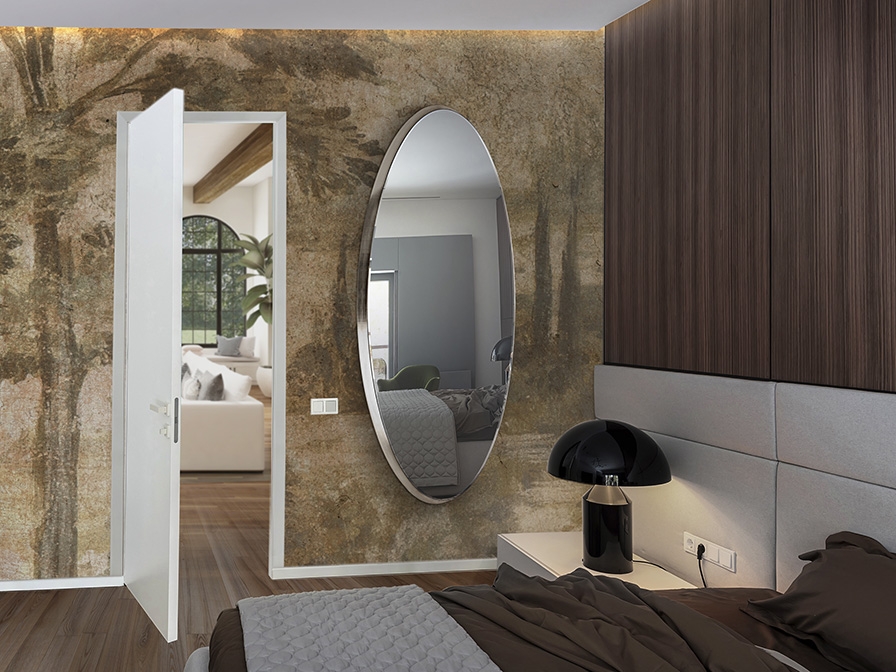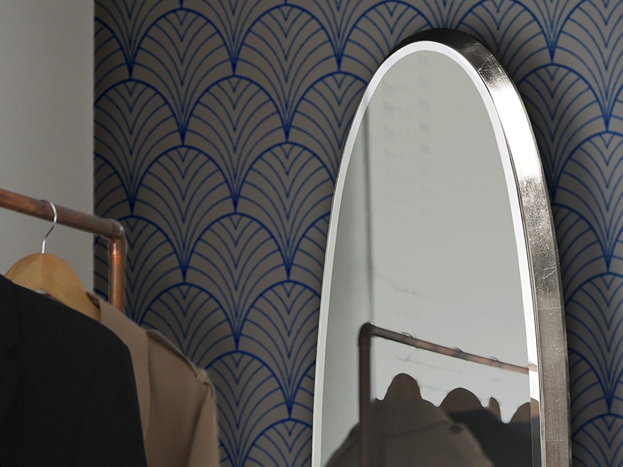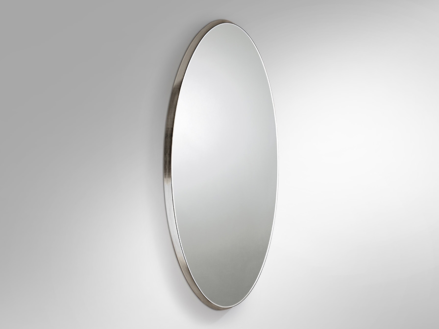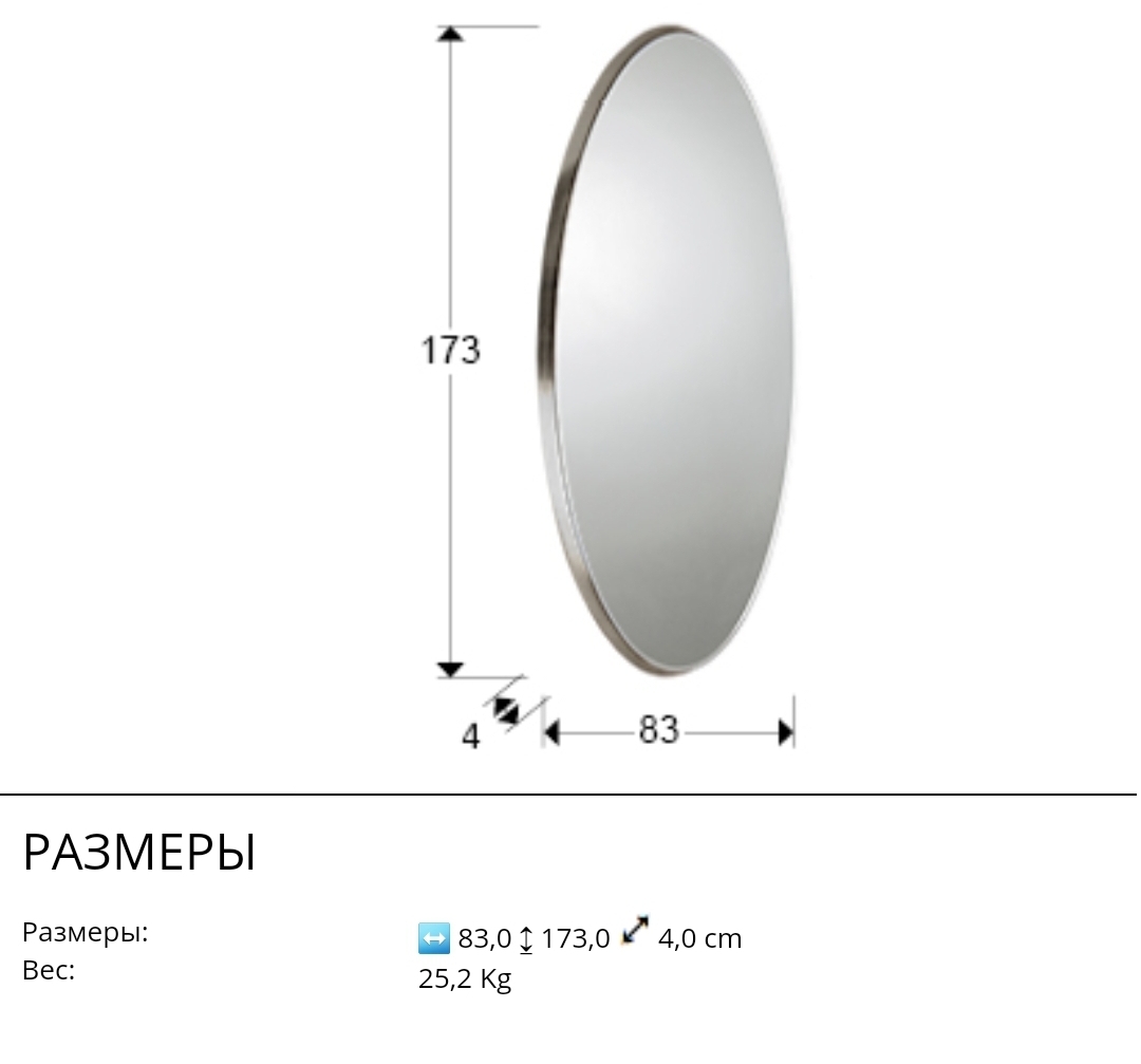 Стильное большое зеркало овальной формы из коллекции Aries с изысканной отделкой объёмной рамы серебряной фольгой, которая видна практически только с боку. Общая высота 173 см. Зеркало с декоративным фацетом по периметру "лежит" поверх рамы, а не традиционно утопленно вглубь неё- это является особенностью всей коллекции Aries.