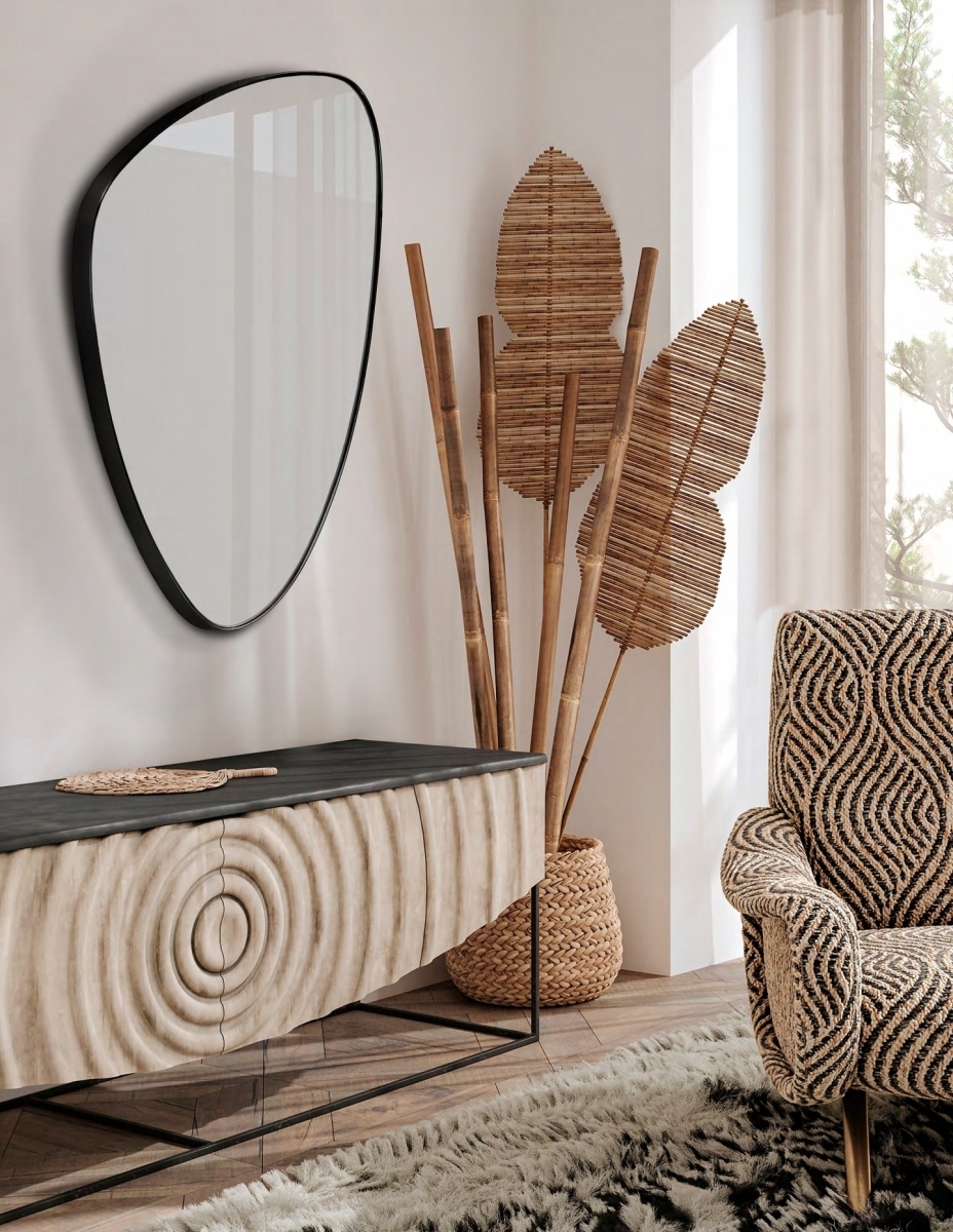 Зеркало- треугольник с новой черной отделкой из коллекции Orio фабрики Schuller в тонкой узкой раме из МДФ. Интересный вариант для оформления современных интерьеров разных стилей от этнического до лофт либо неоклассики. 3 крепежа по углам дают возможность повесить зеркало в трех разных положениях, выбирая наиболее оптимальный для конкретного помещения вид.