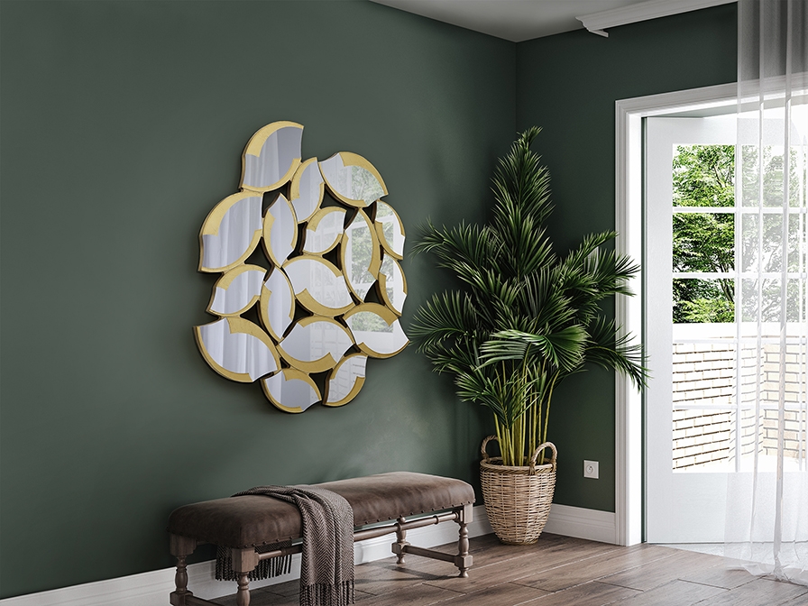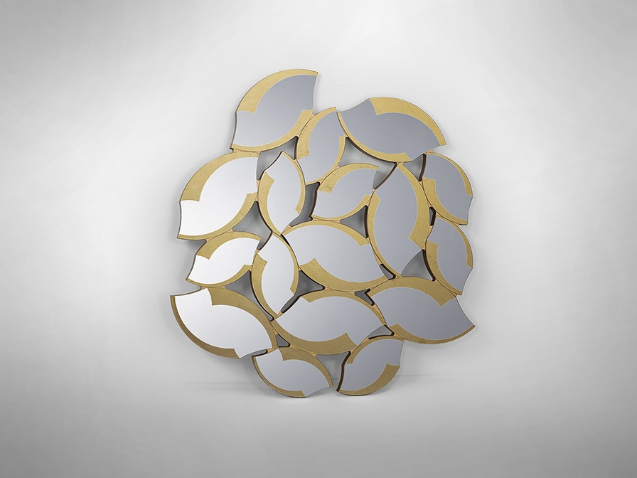 Стильный настенный декор Sandal от испанского бренда Schuller в виде многочисленных золотисто- зеркальных лепестков, собранных на единой резной основе из МДФ также золотистого цвета. Для отделки применена золотая фольга. Интересный вариант для оформления современных интерьеров. Благодаря тому, что сквозь зеркальное панно видно стену, ее цвет, оно гармонично смотрится, не утяжеляя интерьер.