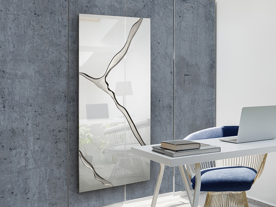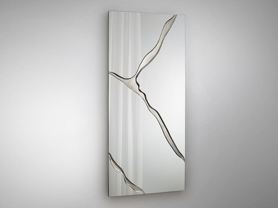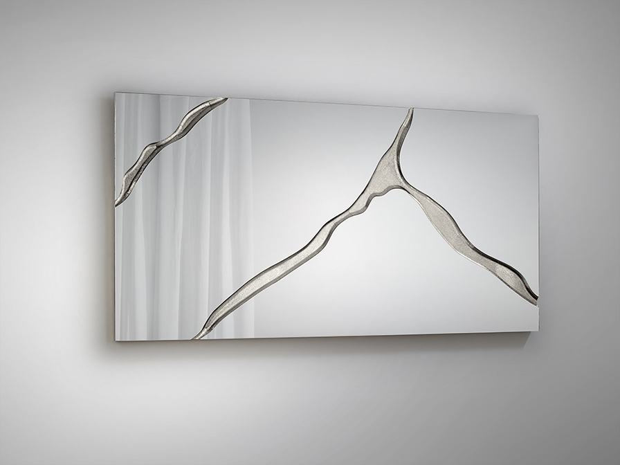 Стильное высокое прямоугольное зеркало Surcos Schuller с применением серебрянной фольги в отделке. Сочетание ассиметрии и глубины плавных линий в центральной части с четкими гранями по краям зеркальной поверхности. Основание этого оригинального панно изготовлено из МДФ серебрянного цвета в тон лицевой стороне. Навеска возможна на выбор: горизонтально или вертикально.