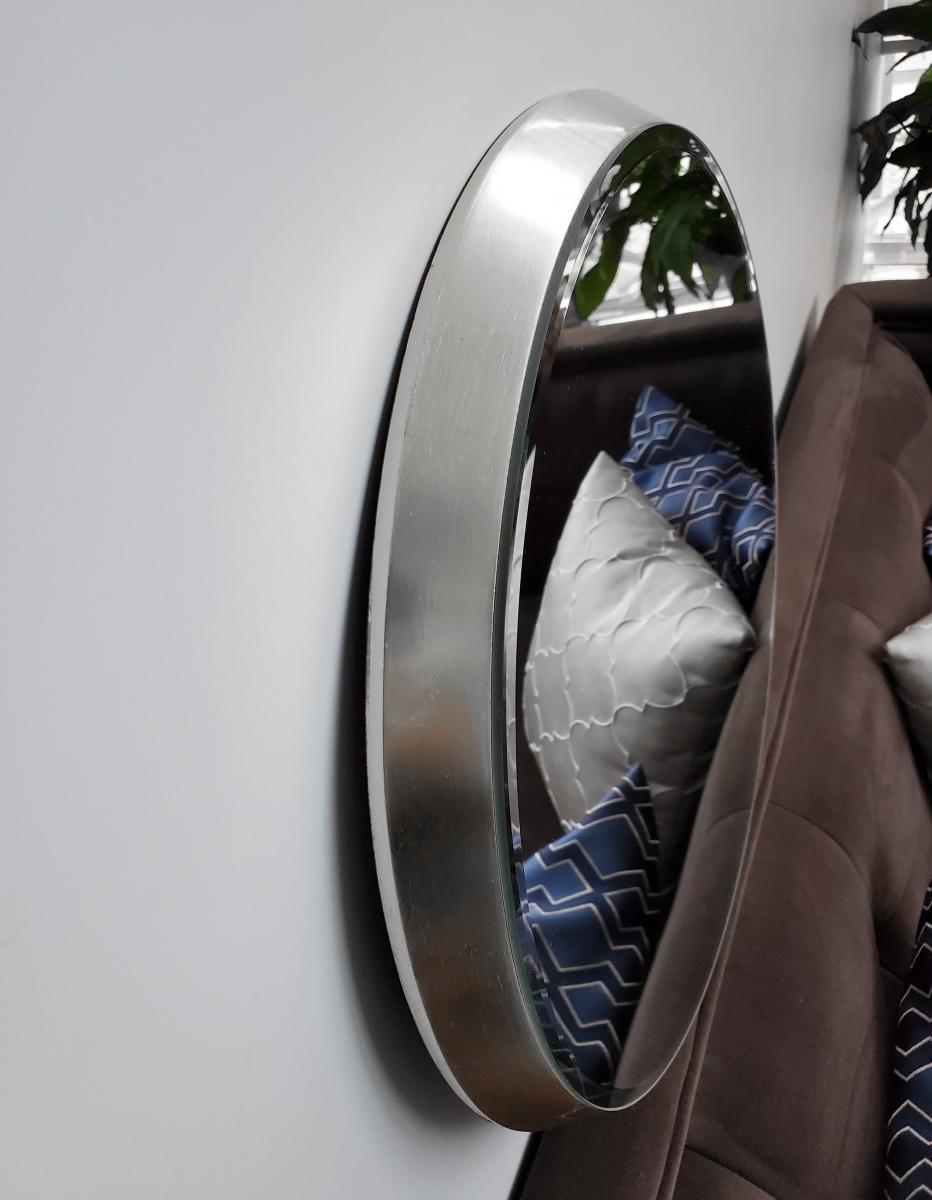 Зеркало круглое из коллекции Aries с объёмной рамой, глубиной 4 см из MDF, покрытой серебряной фольгой. Зеркальное полотно с фацетом закреплено на раме, а не внутри неё, как бывает в традиционных моделях зеркал. В качестве компаньона можно купить зеркало меньшим диаметром- 44 см арт. 119023 либо овальное.