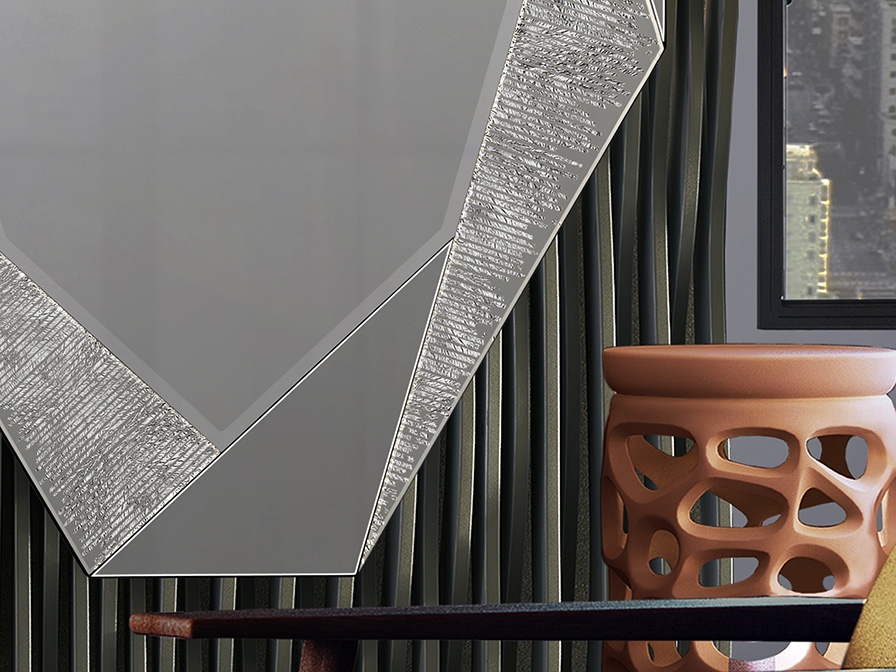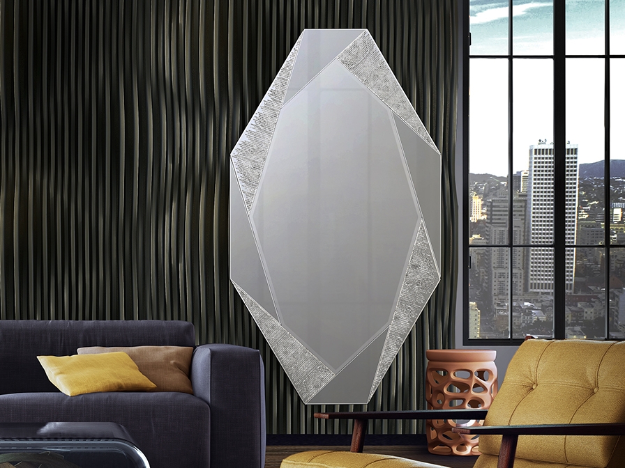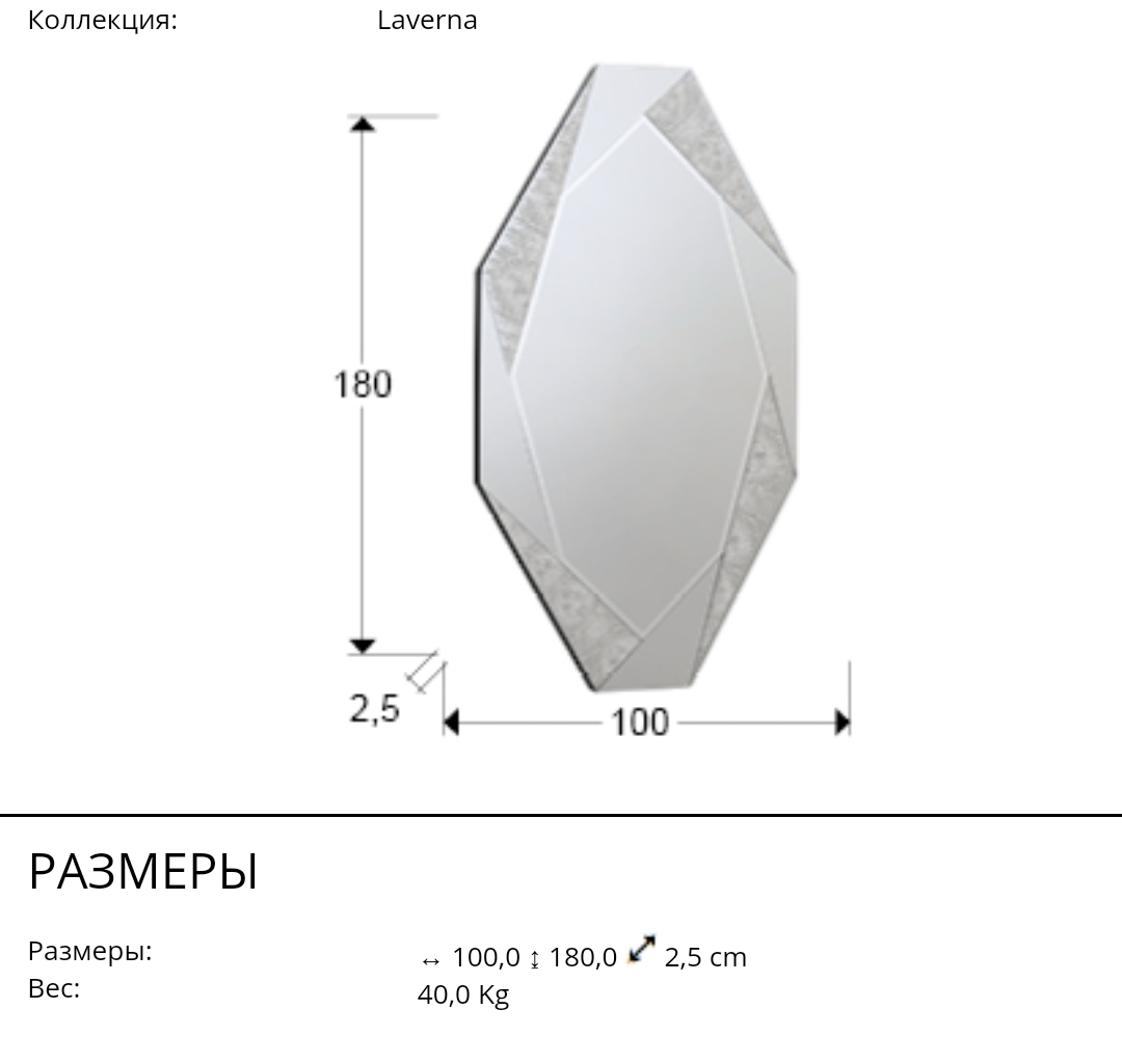 Большое эффектное зеркало- восьмиугольник из коллекции Laverna, особенностью которой является зеркальная рама с серебряной фольгой под стеклом. Высота 180 см, ширина 100 см отлично подходят для просторных помещений: современных холлов либо гостиных комнат. Основание у зеркала сделано из чёрной МДФ, с креплениями для вертикальной либо горизонтальной навески.