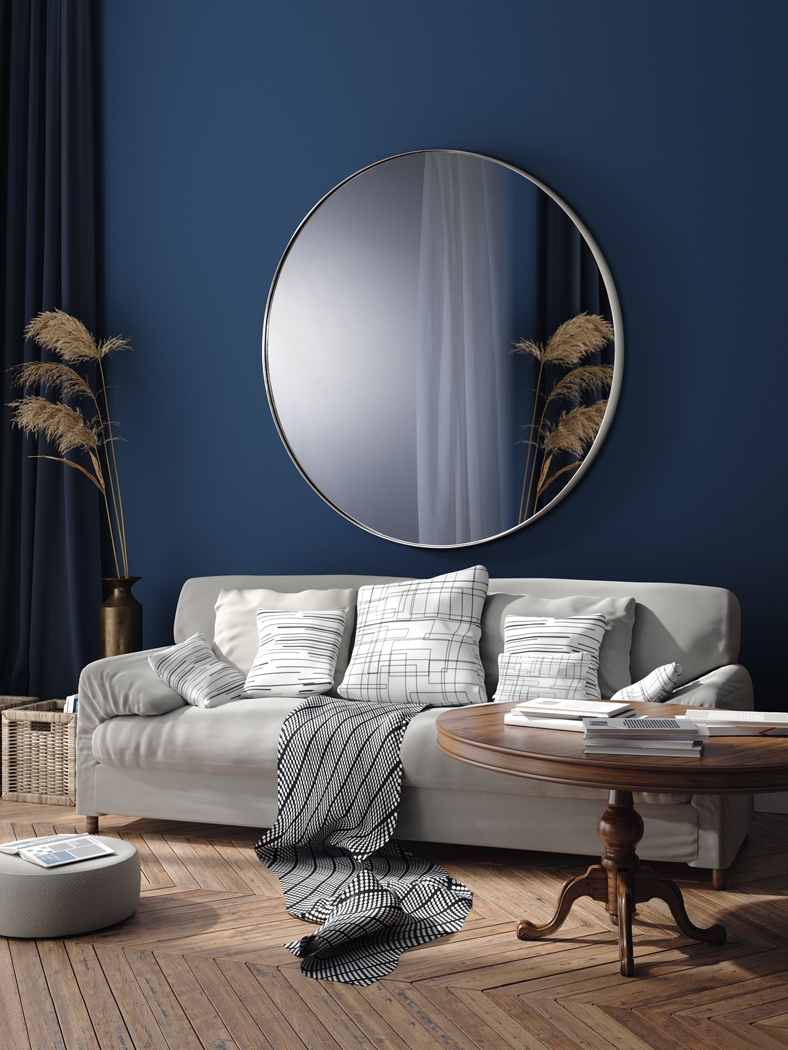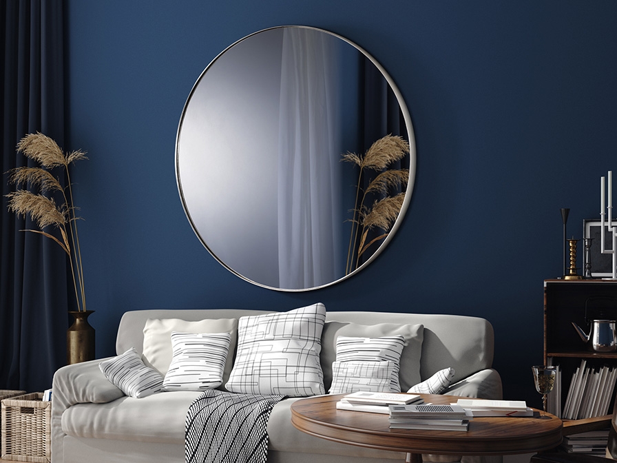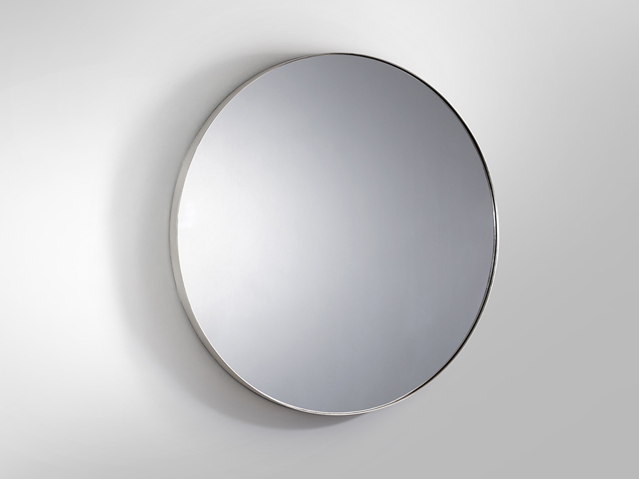 Большое круглое интерьерное зеркало из коллекции Orio диаметром 120 см с тонкой рамой из МДФ в отделке серебрянной фольгой.
