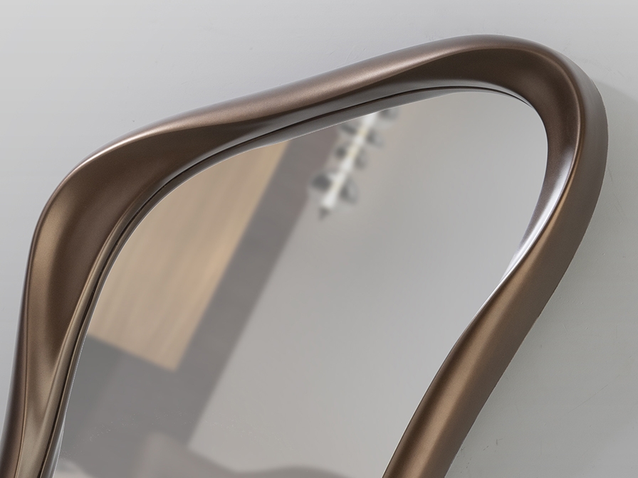 Оригинальная модель высокого зеркала с фигурной обтекаемой рамой из полиуретана Gina. Цвет отделки -темная бронза. Новинка осени 2025 года и находка для тех, кто любит нестандартные предметы интерьера.