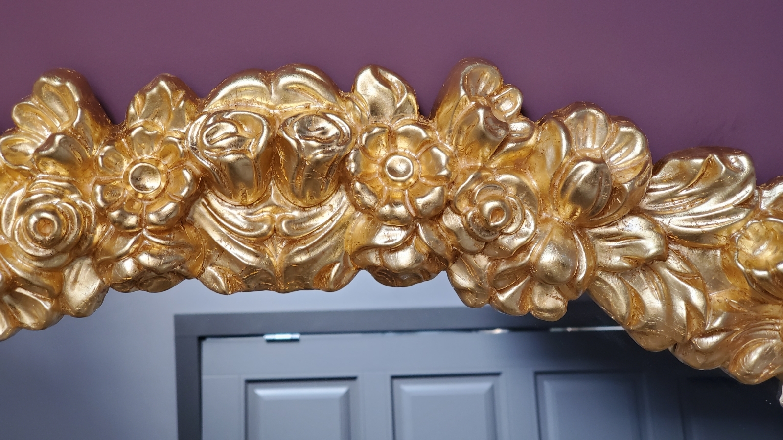 Изысканное золотое овальное зеркало в раме из нежных цветов и распускающихся бутонов с отделкой золотой сусальной фольгой.