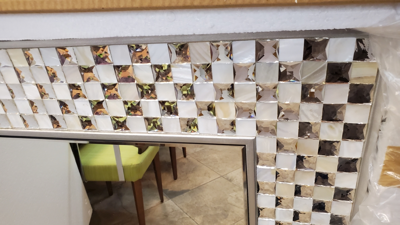 Прямоугольное дизайнерское зеркало Chiara фабрики Schuller. Эффектная рама собрана из небольших квадратиков перламутра и зеркального стекла с огранкой в двойном обрамлении узкой серебристой окантовки. Центральное зеркало по периметру украшает декоративный фацет. Основание из МДФ серебряного цвета подготовлено для навески в горизонтальном либо вертикальном положении. Купить зеркала фабрики Schuller с быстрой доставкой по Москве либо отправкой в Санкт-Петербург и другие города России можно в нашем интернет-магазине. Возникают вопросы? Пишите либо звоните, будем рады помочь с подбором зеркал и светильников.