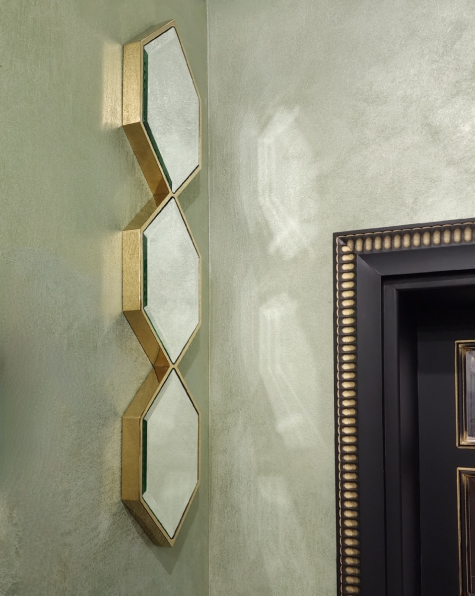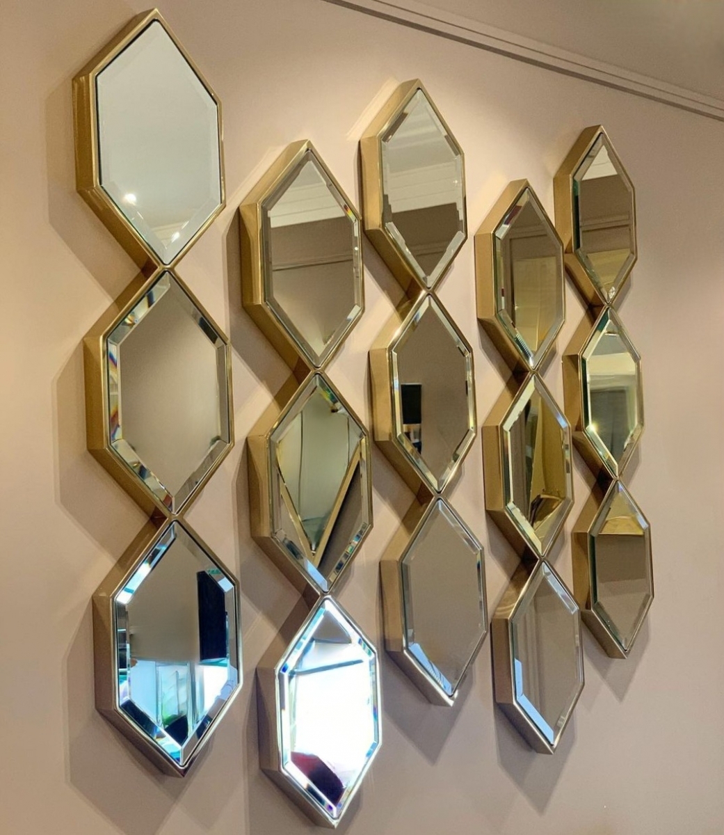 Красивое зеркальное панно Sarrono арт.111075 от голландского бренда Eichholtz. Зеркальные шестигранники в обрамлении глянцевого золота. Рама массивная металлическая высотой 110 см. По периметру каждого ромба сделан красивый широкий фацет. При оформлении современного интерьера эти зеркала наиболее эффектно смотрятся при парном сочетании. Купить зеркало Eichholtz в Москве с быстрой доставкой легко в нашем интернет-магазине, сделав заказ на сайте, по телефону либо электронной почте.