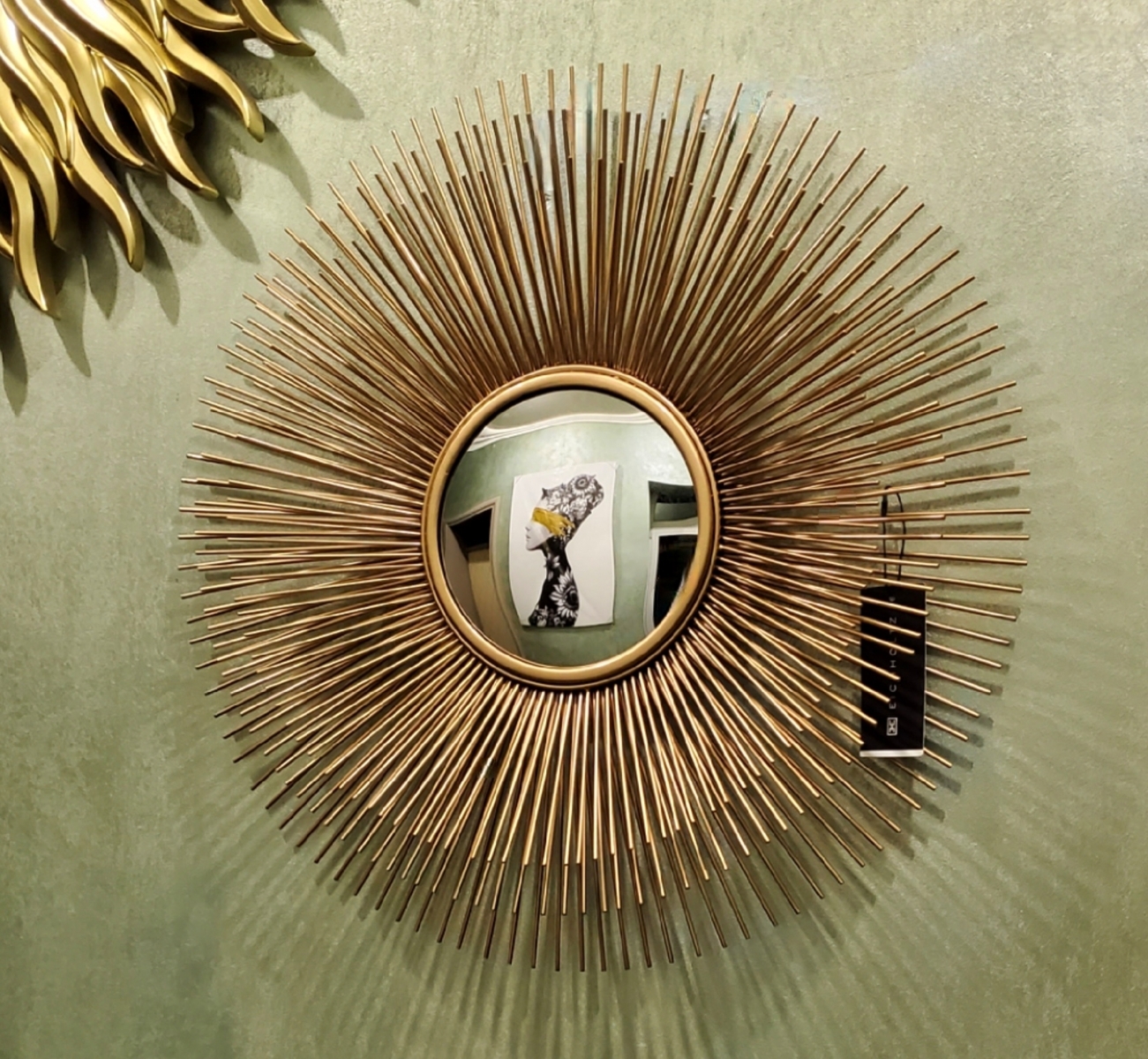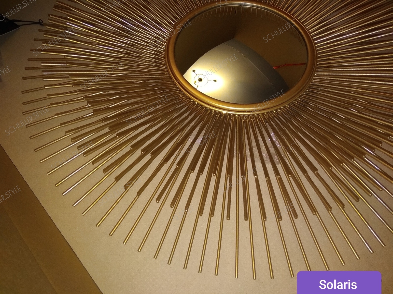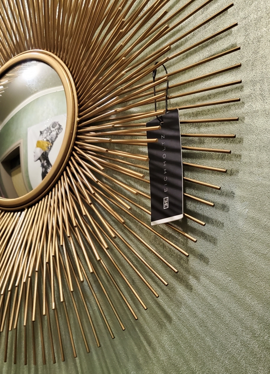Эффектные золотые солнечные лучи из металла разной длины расположены в три ряда, тем самым создавая красивую объёмную раму у зеркала Solaris S от голландского бренда Eichholtz. Отделка: матовое золото. Центральное декоративное круглое зеркало имеет выпуклую форму. Зеркало Солнце из коллекции Solaris производят в двух диаметрах: 60 и 80см. В нашем интернет-магазине для оформления современного интерьера можно заказать и купить любую из этих моделей либо подобрать альтернативные варианты для декора стен.