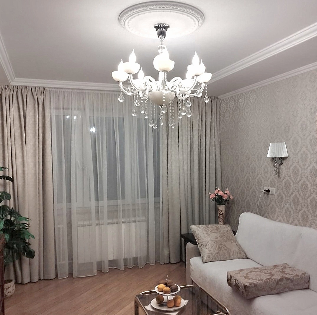 В гостиную с классическим оформлением и активным вензелем на обоях для обновления были выбраны портьеры и тюль с нейтральным рисунком, современные бра Mercury Schuller с прозрачными ножками- шарами и белая красавица люстра с похожими элементами от бренда Crystal lux.