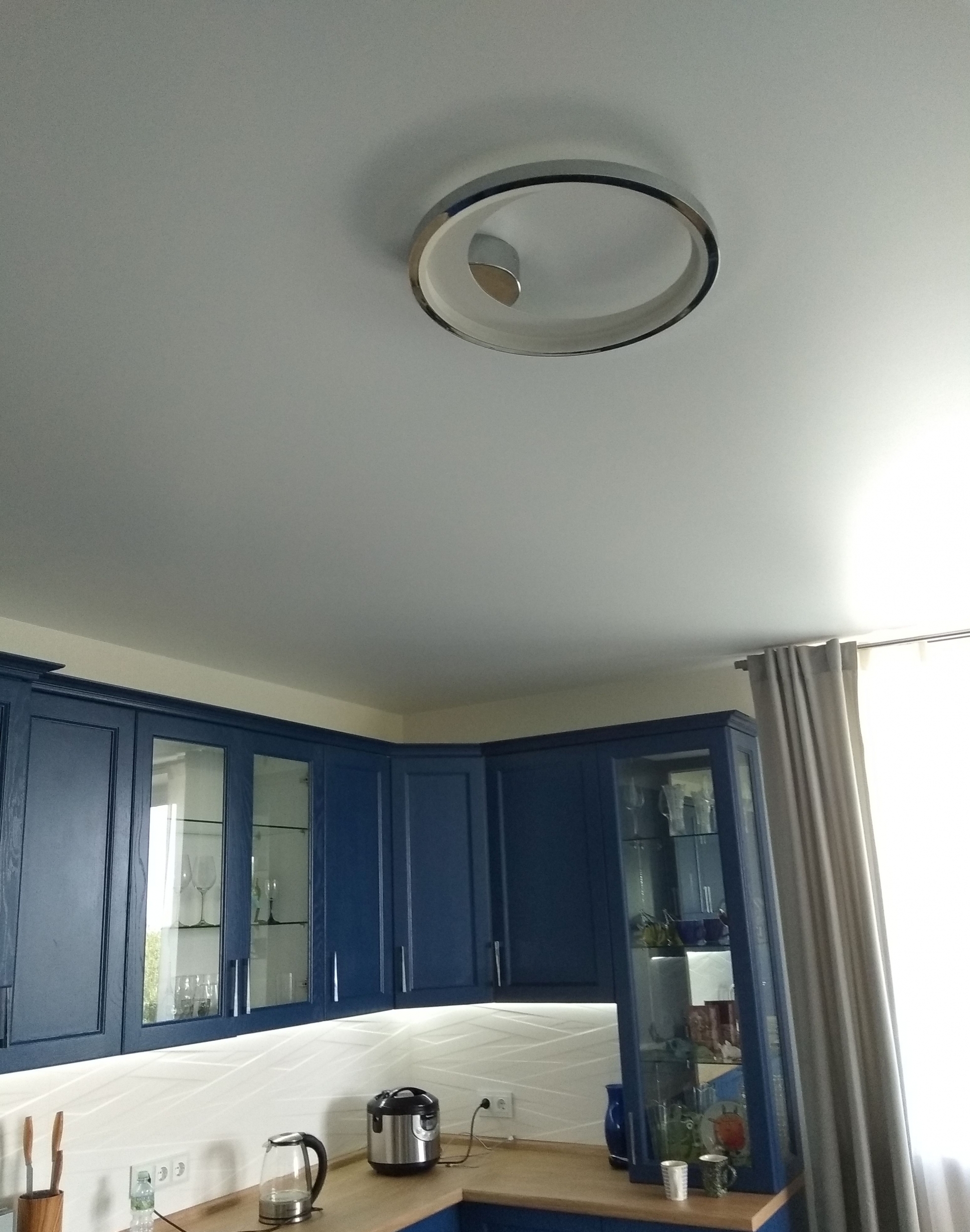 Потолочная ассиметричная модель из коллекции светодиодных светильников Laris отлично подошла в интерьер яркой современной синей кухни- столовой в качестве небольшого акцента на потолке. Диаметр всего 43 см, теплый свет 3000 К.