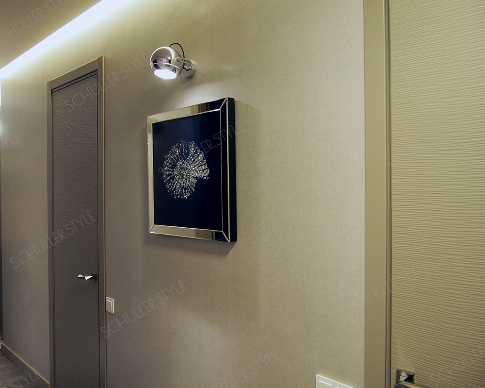 Зеркальная картина Fosil с изящной ракушкой на тёмно-синем, насыщенном фоне стала акцентом в холле современного интерьера квартиры, оформленной в морской тематике.