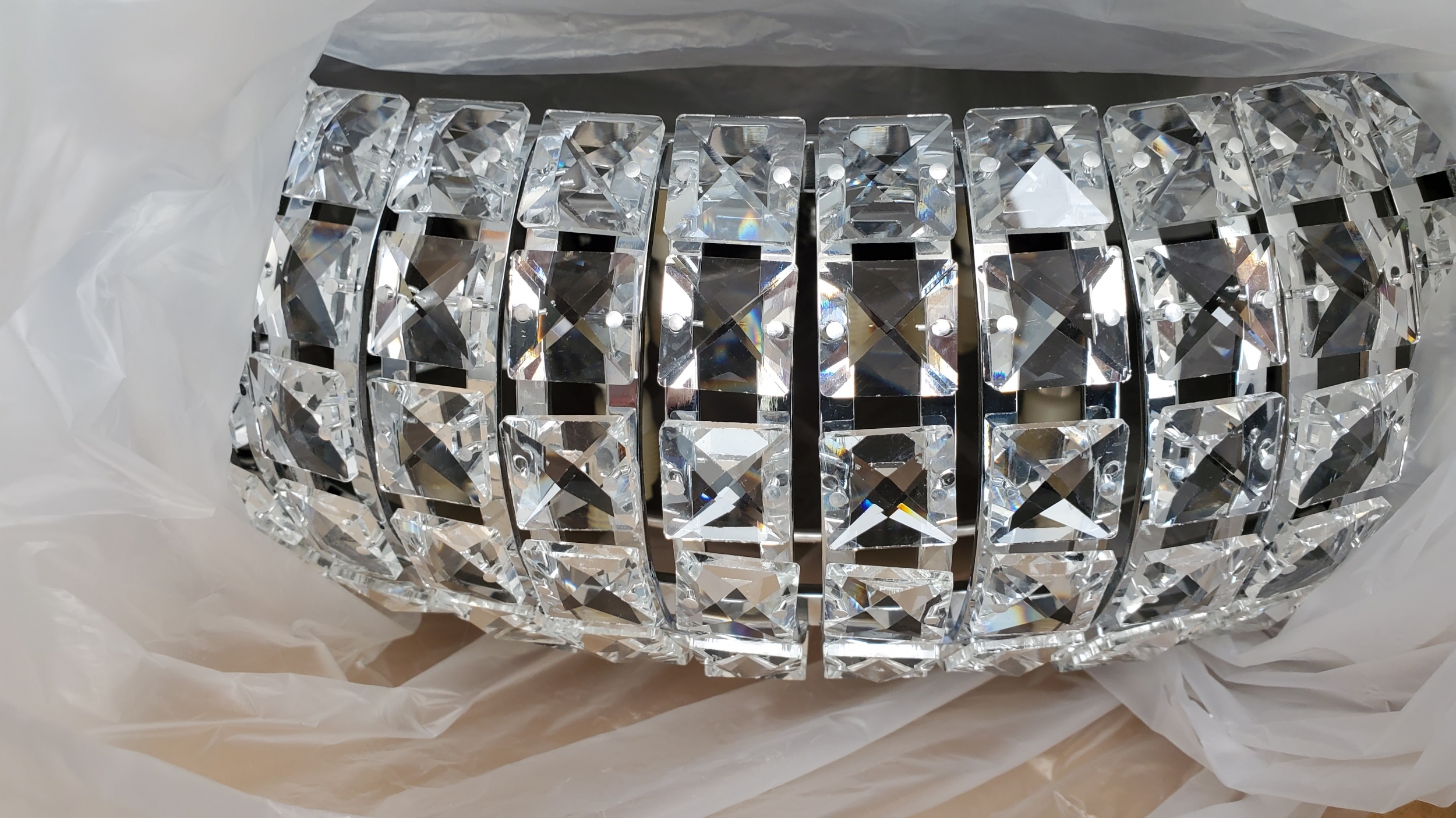 Большой потолочный светильник из коллекции Diamond с многочисленными прозрачными кристаллами на плафоне в интерьере спальни. Лампочки 6W теплого света с цоколем G9 поставлены из комплекта, при желании их можно заменить на более яркие по мощности.