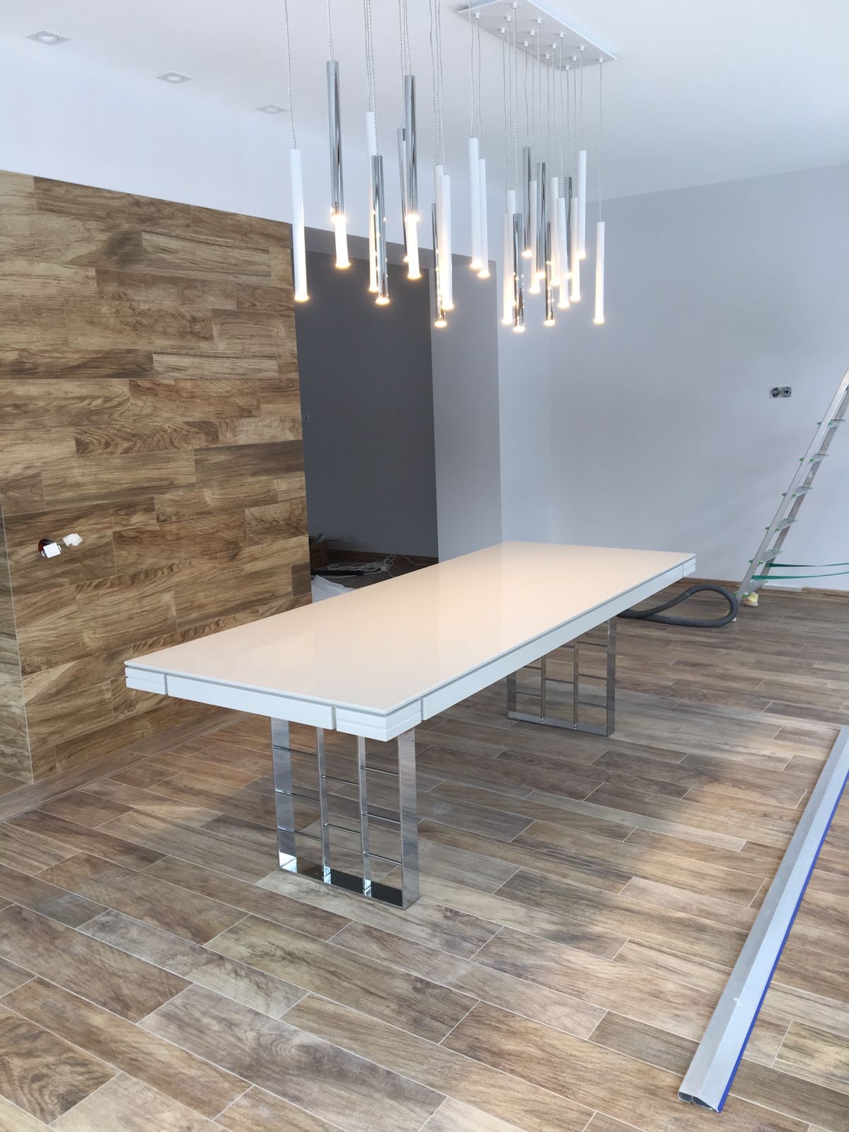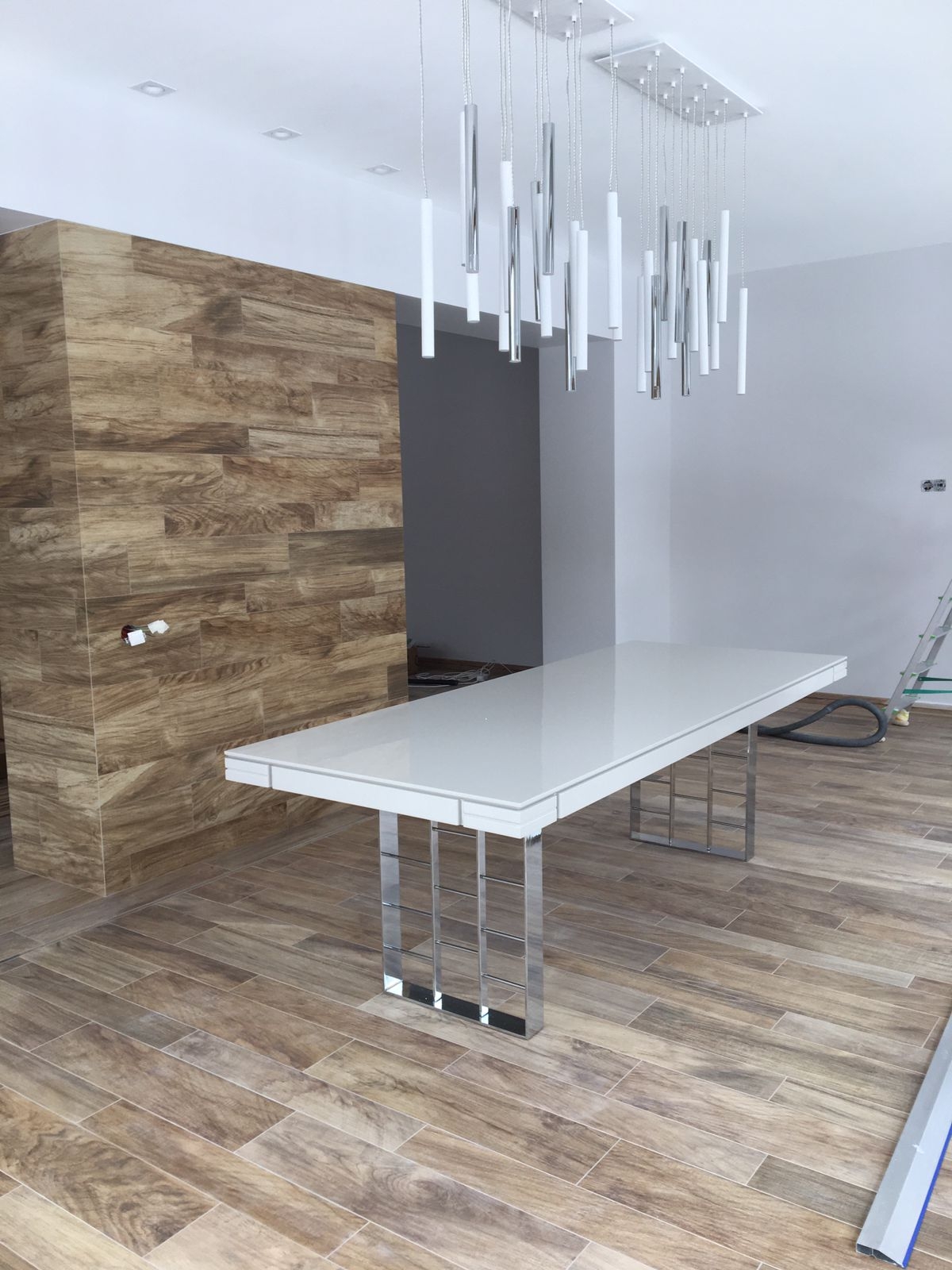 Для оформления интерьера загородного дома дизайнер выбрал белую модель светильника из коллекции Varas с хромированной отделкой. Учитывая большое пространство комнаты, над длинным 240 см обеденным столом Vita было решено собрать композицию из двух стандартных люстр по 14 подвесов. Получилось в итоге стильно и оригинально.