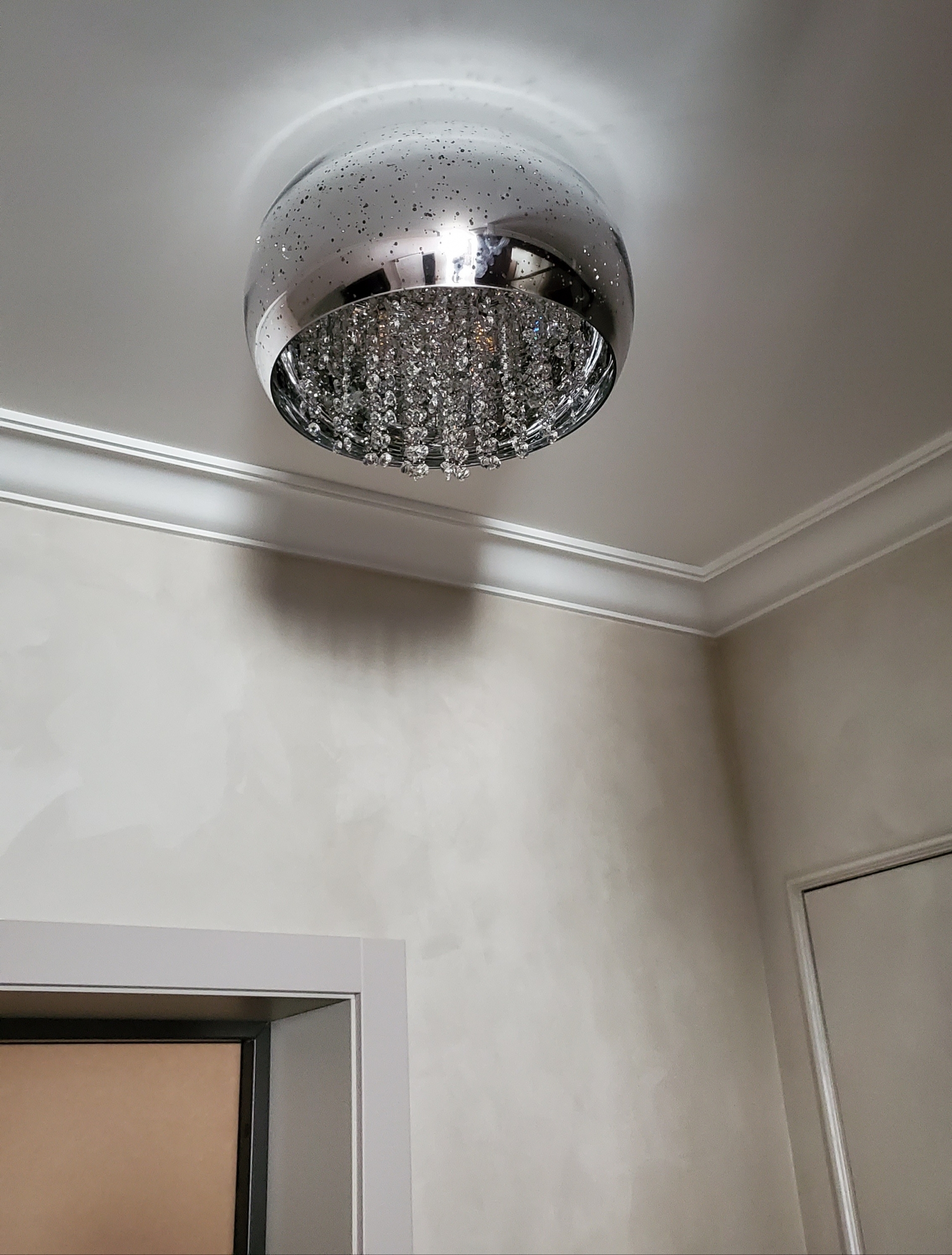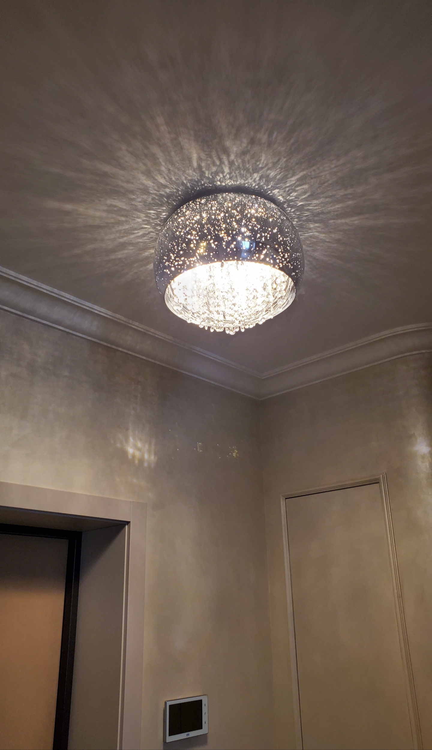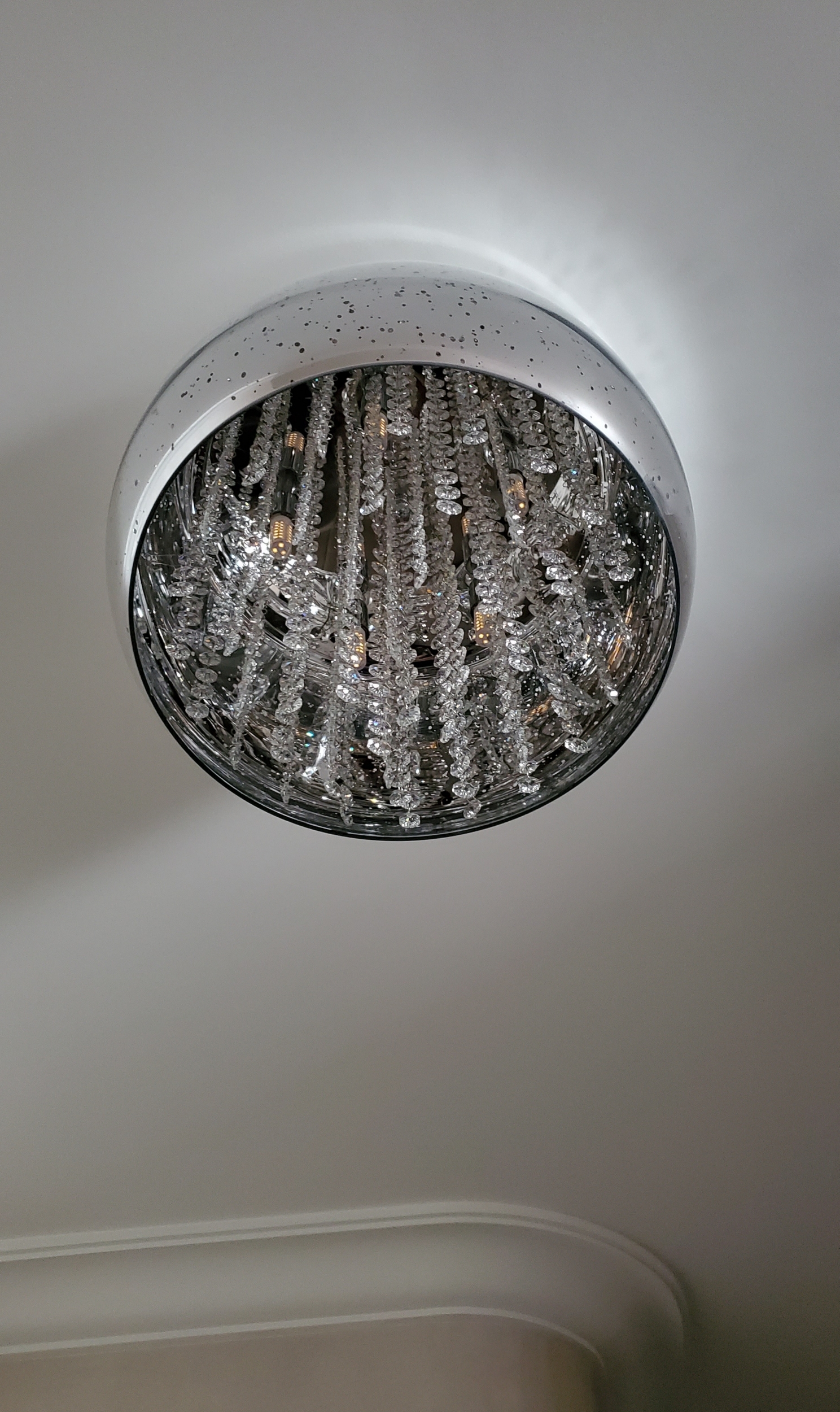 Звёздная модель- потолочный светильник с зеркальным плафоном из коллекции Caelum с прозрачными стеклянными подвесками внутри.