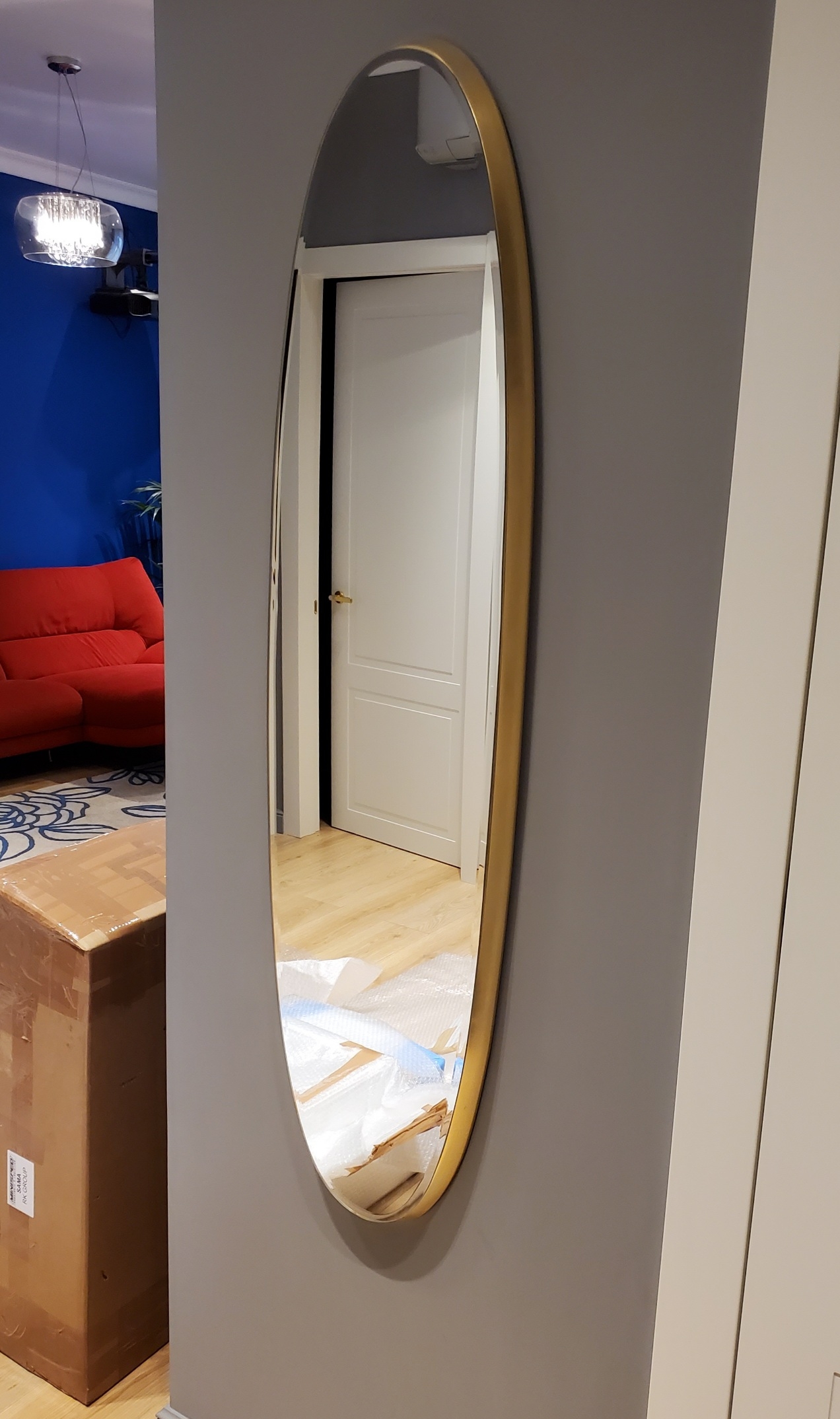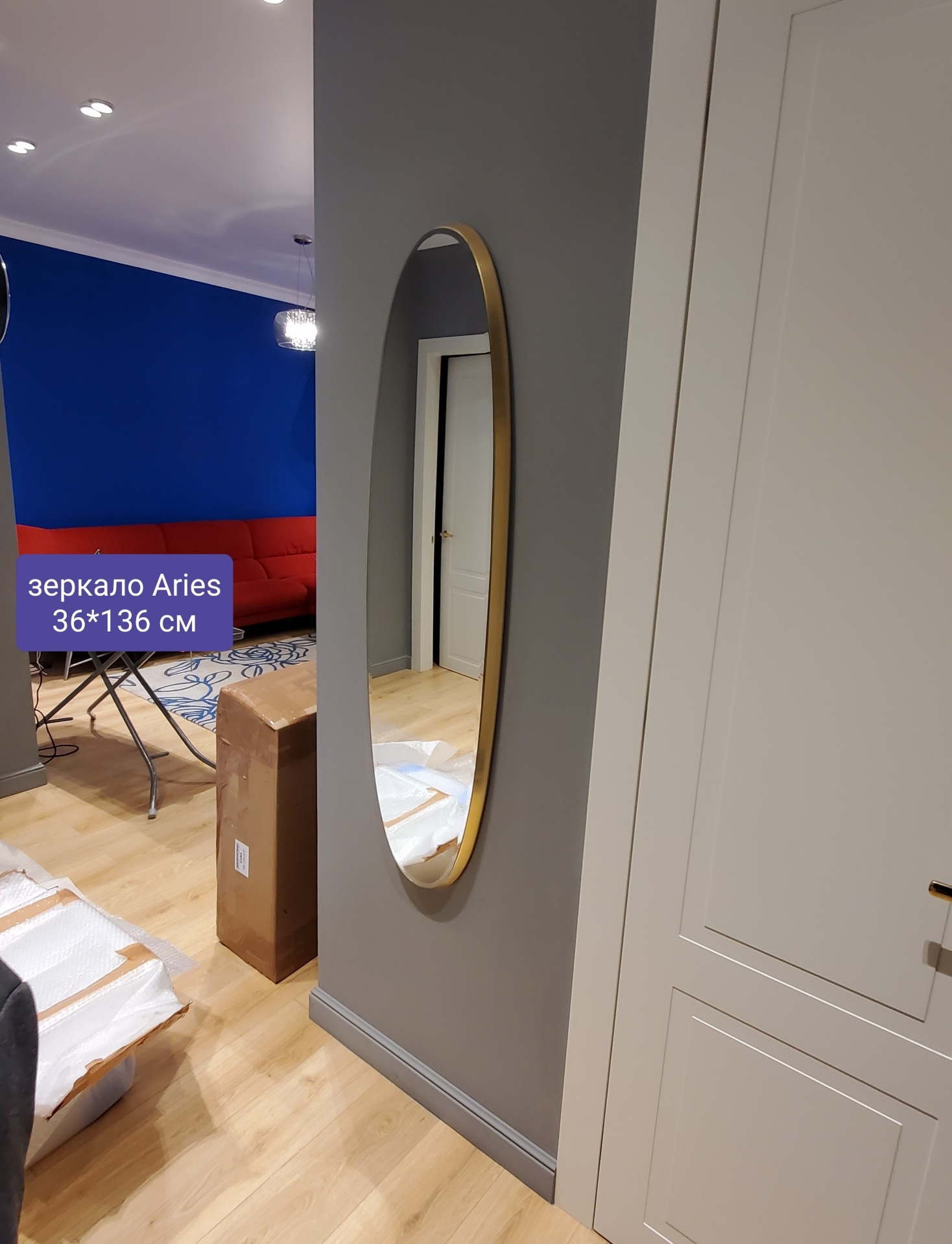 Идеальное для небольших пространств прихожих зеркало Aries фабрики Schuller с объёмной рамой, декорированной золотой фольгой. Зеркальное полотно с декоративным фацетом не утоплено внутрь, но закреплено так, что виден его шлифованный край.
