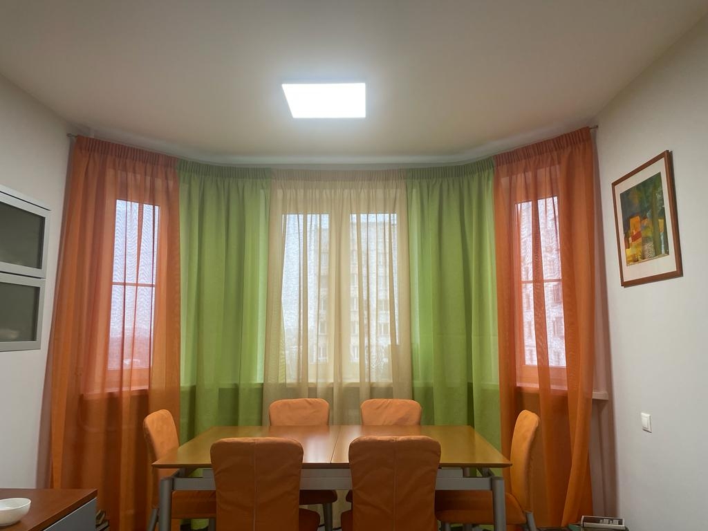 Сочные краски и контрастные цвета были выбраны для оформления гостиной комнаты в городской квартире. Заказчица очень любит сочные оттенки- напоминание о цветущей весне и благоухающем лете + высказала пожелание о воздушности штор. Как в сказке: портьеры без тюли, но чтобы пропускали свет. И такой вариант был найден благодаря мягкой пластичной ткани, похожей на сетку, но с более плотным переплетением нитей. Зеленый, оранжевый и золотисто- бежевый внесли желаемый яркий акцент в спокойный интерьер. Хозяйка штор довольна, мы тоже).