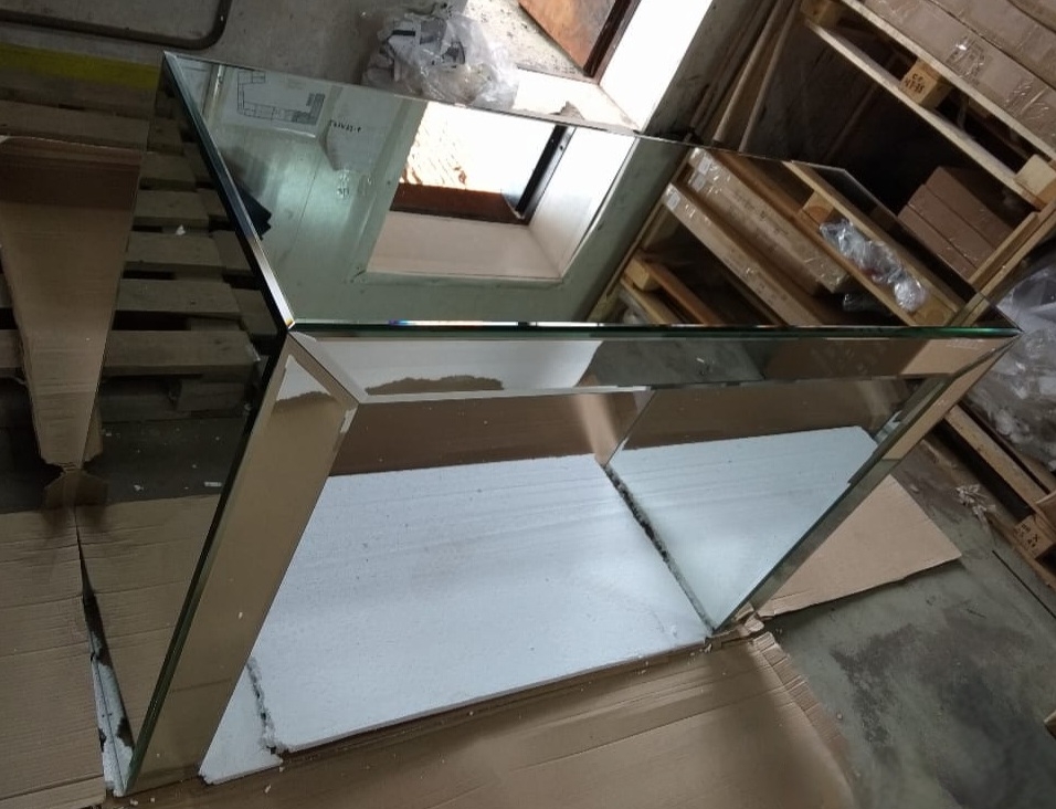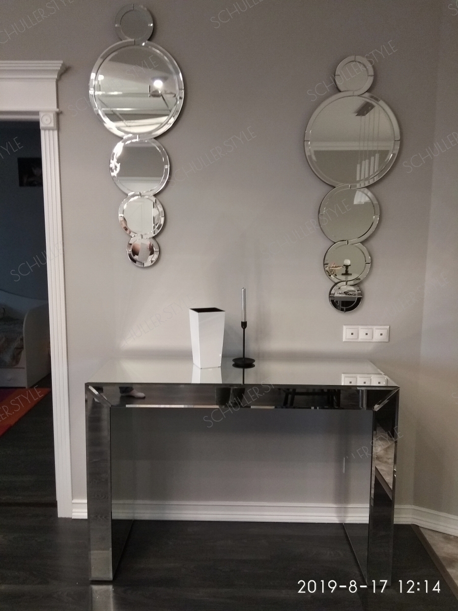Красивый настенный декор Mercury Schuller в виде круглых зеркал разной формы. С их помощью эффектно оформлена зона в гостиной комнате над зеркальной консолью, которую можно купить из наличия.