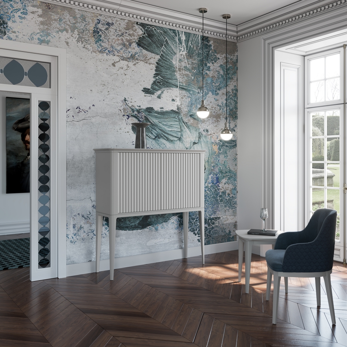Элегантный барный шкаф на высоких ножках из коллекции Мария испанской фабрики Mugali. Фрезеровка на дверцах добавляет изысканности, благодаря вертикальным линиям, при желании можно выбрать другой тип гравировки из трех. Изготовленный в любом цвете бар станет украшением интерьера. В стандартном исполнении полки делают из мдф, опционально - из стекла, с дополнительной led подсветкой внутри.