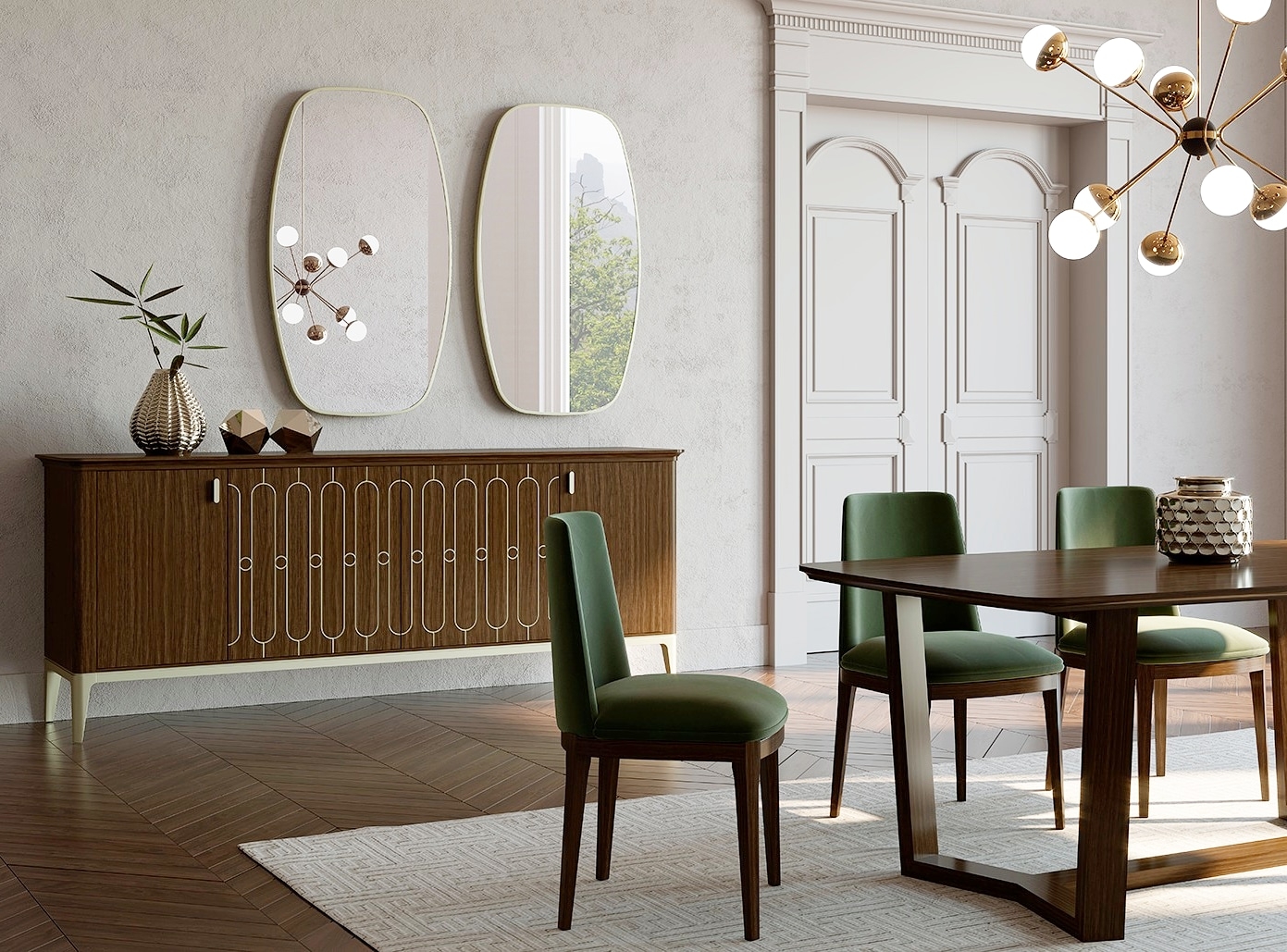 Красивый комплект: длинный комод "под дерево" и зеркала компаньоны из новой коллекции Мария от испанской фабрики Mugali. Купить комод можно отдельно от зеркал. Комод изготовлен с четырьмя глухими дверцами, на двух из них сделана фигурная контрастная гравировка бежевым цветом. При желании её можно сделать и на других ящиках. Индивидуальный выбор ручек, цвета, возможность его комбинирования на разных деталях мебели, позволяет создавать уникальную мебель под конкретный интерьер квартиры. Обеденный стол и стулья , как на фото, можно сделать в одном цвете с корпусной мебелью. На выбор есть несколько оттенков коричневого цвета, имитирующих дерево. Современная испанская мебель украшает многие интерьеры в Москве и Санкт-Петербурге.