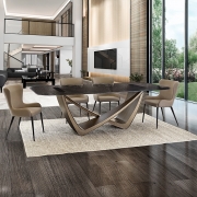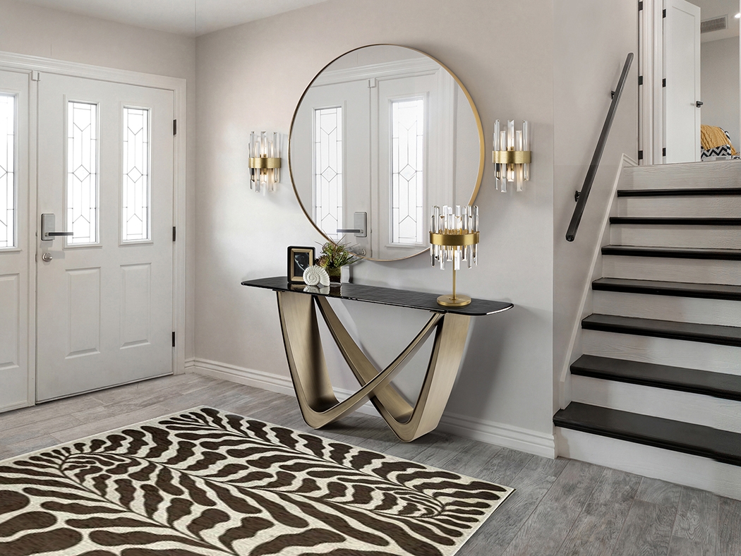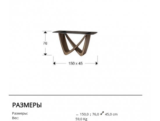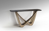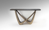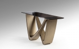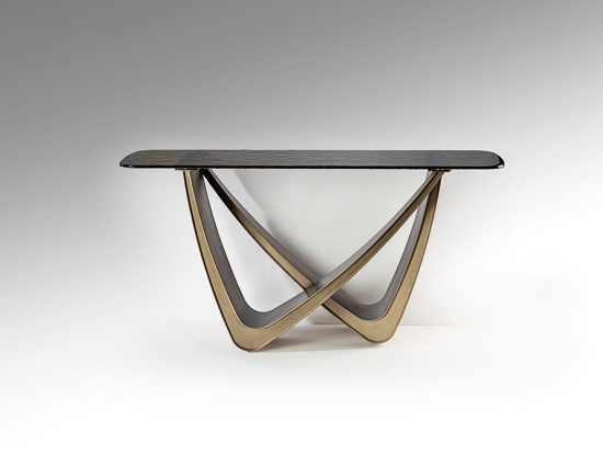 Современный консольный стол из новой коллекции мебели Genesis изготовлен с эффектной металлической ножкой из металла с отделкой в цвете состаренной бронзы. Столешница из серого термоформованного стекла имеет фактурную слегка волнистую поверхность. В каталоге фабрики Schuller это модельный ряд 2026 года вместе с обеденными столами на 205 и 240 см.