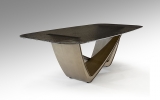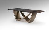 Современный обеденный стол Genesis с фигурной ножкой бабочкой из металла с отделкой цвета состаренной бронзы. Столешница 240 см изготовлена из серого закаленного стекла с фактурной поверхностью.
