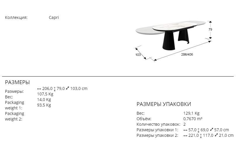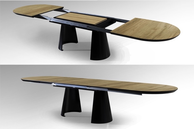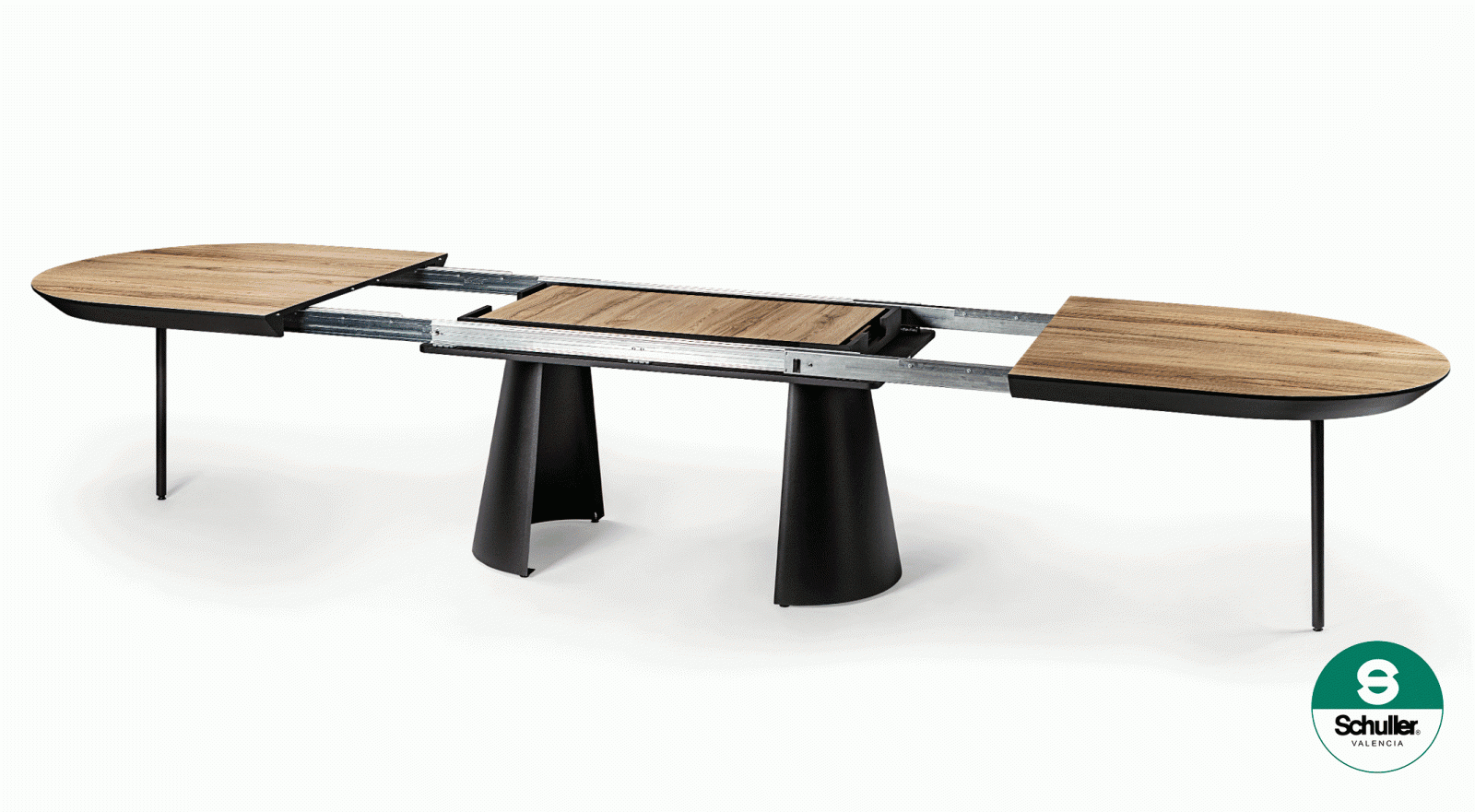 Большой современный обеденный стол из новой коллекции Capri от Schuller с оригинальными стальными радиусными ножками с черным матовым покрытием. Благодаря четырем внутренним вставкам (по 50 см каждая), общая длина овального стола может составить 4 метра. В связи с этим, в комплекте поставляются 2 дополнительные ножки для обеспечения устойчивости столешницы. Она изготовлена из МДФ с меламиновым покрытием высокой стойкости к внешним воздействиям, имитирующим натуральный дуб. Общая ширина стола 103 см. Рисунок на вставках без подбора к основной поверхности.