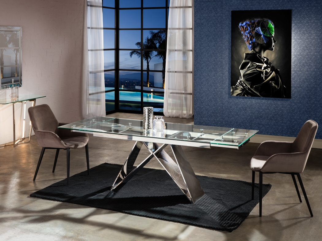 Лаконично, стильно- так выглядит новинка из коллекции Mika от фабрики Schuller- обеденный стол арт. 713016 из закаленного стекла и х- образных геометричных ножек из полированной стали . Благодаря тому, что стол можно сложить либо разложить от 160 см до 200 см: с каждой стороны вставка по 20 см, он отлично подходит для гостиной в современном стиле. * Все предметы интерьера на фото, включая эффектный фотопостер на стекле "Гейша", консоль с подсветкой Zaila, а также кресла с подлокотниками ALOHA от испанского бренда Schuller, можно купить в нашем интернет-магазине в Москве с оперативной доставкой по России.