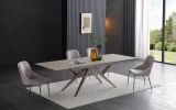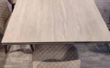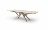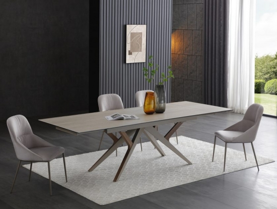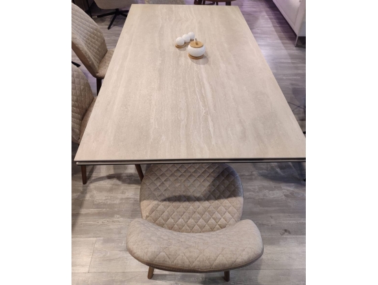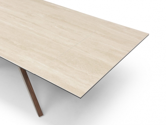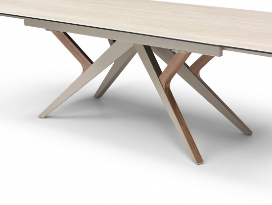 Современный раздвижной стол DT2448 бренда Esf с боковыми вставками по 40 см, увеличивающими общую длину до 260 см. Столешница сделана из керамики толщиной 6 мм в цвете светлого травертина на закаленном стекле. Подстолье с ножками выполнены из металла одного тона и конструктивно дополнены оригинальными вставками из массива дерева и шпона ореха (цвет TAUPE). Сочетание цветов и фактур, приятное для восприятия в интерьере гостиной либо минималистичной кухни.