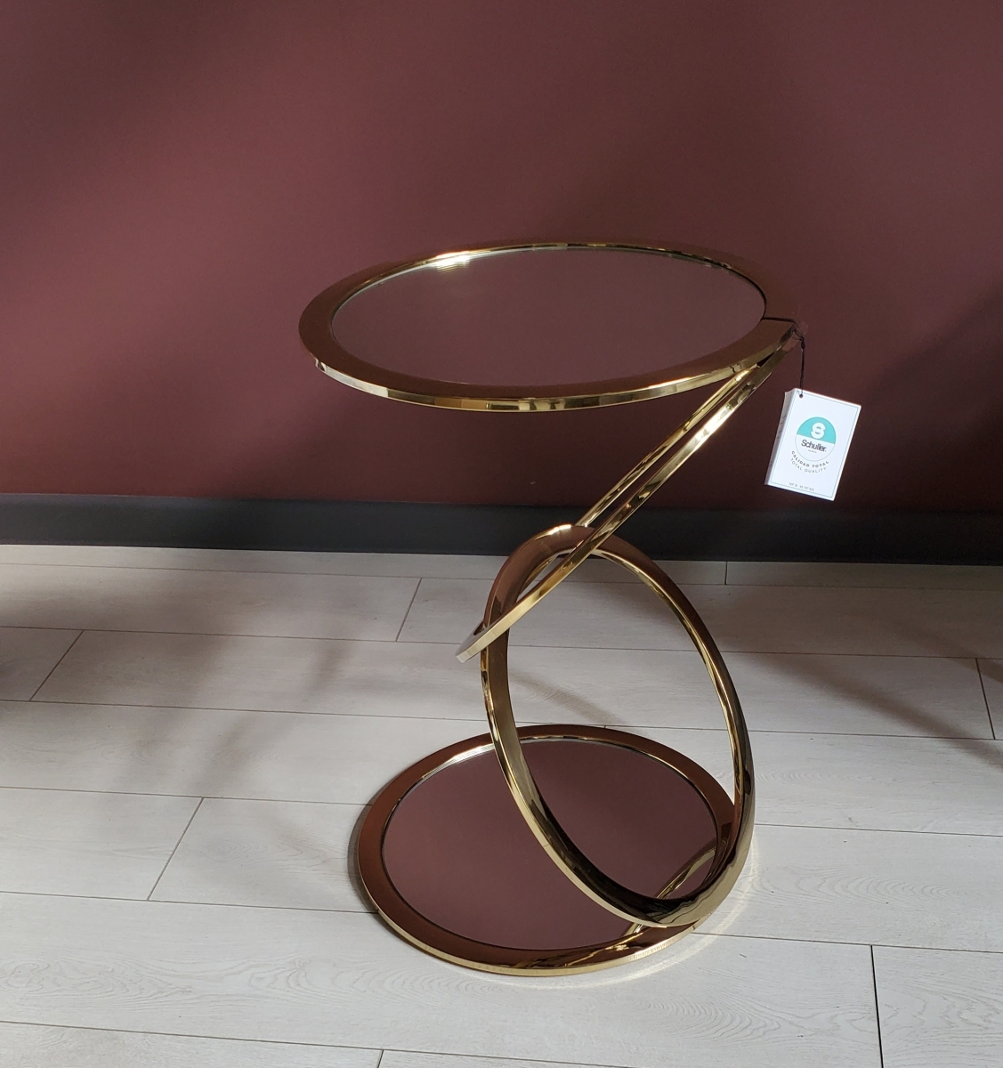 Интересная модель журнальных столиков Aros испанского бренда Schuller в стильном золотом глянце. Внимание привлекает оригинальная форма высокой 65 см ножки в виде скреплённых между собой двух колец. Столешница у прикроватного столика и круглое основание- сделаны из зеркала толщиной 6 мм. Всё вместе создаёт эффектный предмет интерьера, который прекрасно подходит для оформления квартиры, офиса или коттеджа в современном стиле. Столы из этой коллекции - интересная альтернатива прикроватным тумбочкам. Купить любой кофейный столик из каталога можно в нашем интернет-магазине с доставкой по Москве либо оперативной отправкой по России.