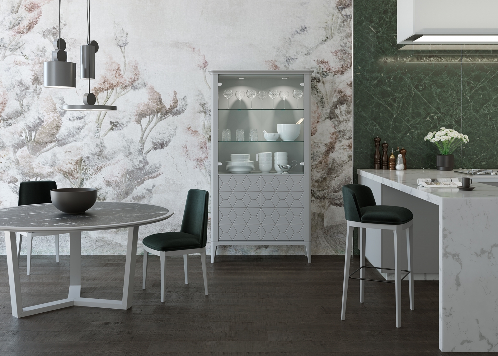 Стильная модель витрины с дверцами двух типов: сверху стеклянные, внизу глухие с декоративной фрезеровкой, которая может быть окрашена в контрастный цвет относительно основного каркаса. Наполнение с глухими дверьми: 1 полка. Наполнение со стеклянными дверьми: 2 полки. По желанию можно сделать led подсветку в верхней части витрины со стеклом. Фабрика Mugali производит коллекцию Maria с учётом пожеланий заказчиков, создав стандартную размерную линейку с возможностью выбора по высоте, ширине и наполнению, поэтому многие дизайнеры выбирают испанскую мебель для оформления современных интерьеров.
