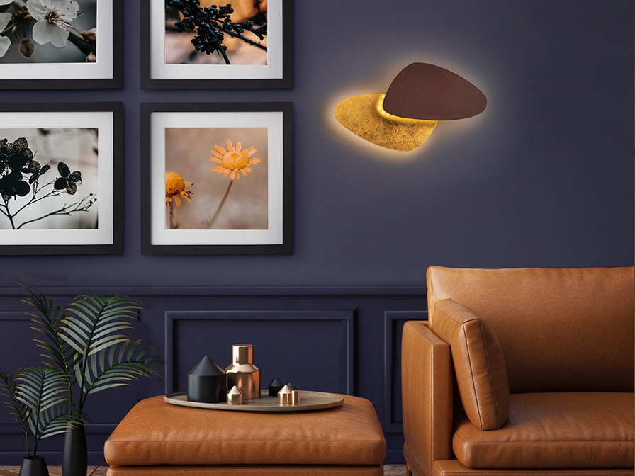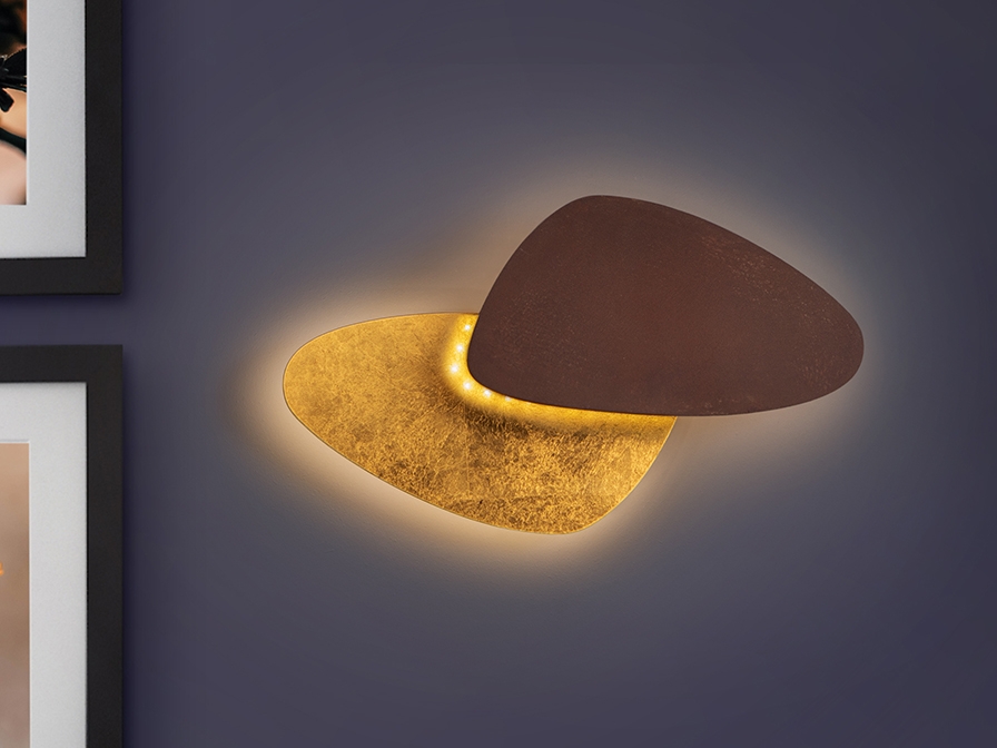 Интересная модель двухцветного бра Contra с оригинальным плафоном из металла коричнево-ржавого цвета в сочетании с покрытием из золотой фольги. 12W LED, 1576 Lm, теплый свет 3000K.