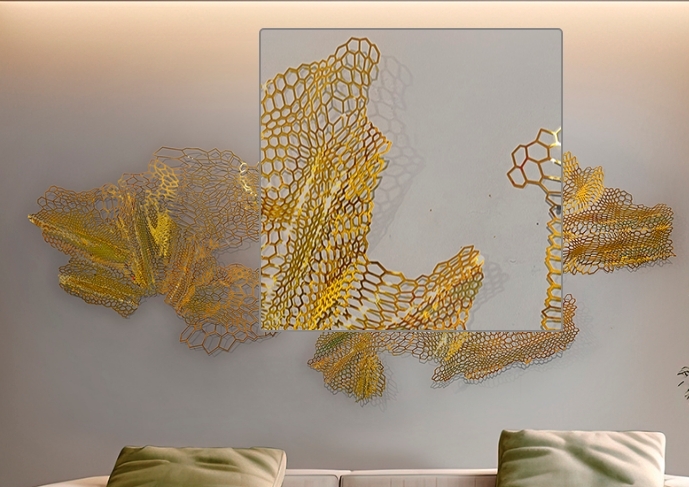 Современная настенная скульптура Drako выполнена из листовой нержавеющей стали с перфорированным геометрическим сетчатым рисунком, сформированным в форме гигантского дракона. Глянцевая золотая отделка добавляет акцента необычному декору. Эффектный вариант для оформления больших пространств.