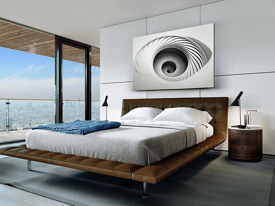 Бесконечность витиеватой спирали- интересный акцент для интерьера. Большой черно- белый фотопостер Morphia на закаленном стекле 100* 150 см отлично смотрится среди минимализма окружающей обстановки. Толщина стекла всего 4 мм.
