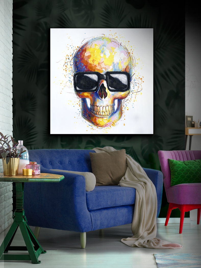 Для тех, кто любит смелые интерьерные решения и относится к жизни с юмором, отлично подходит картина Catrina от фабрики Schuller с изображением яркого улыбчивого черепа в очках.