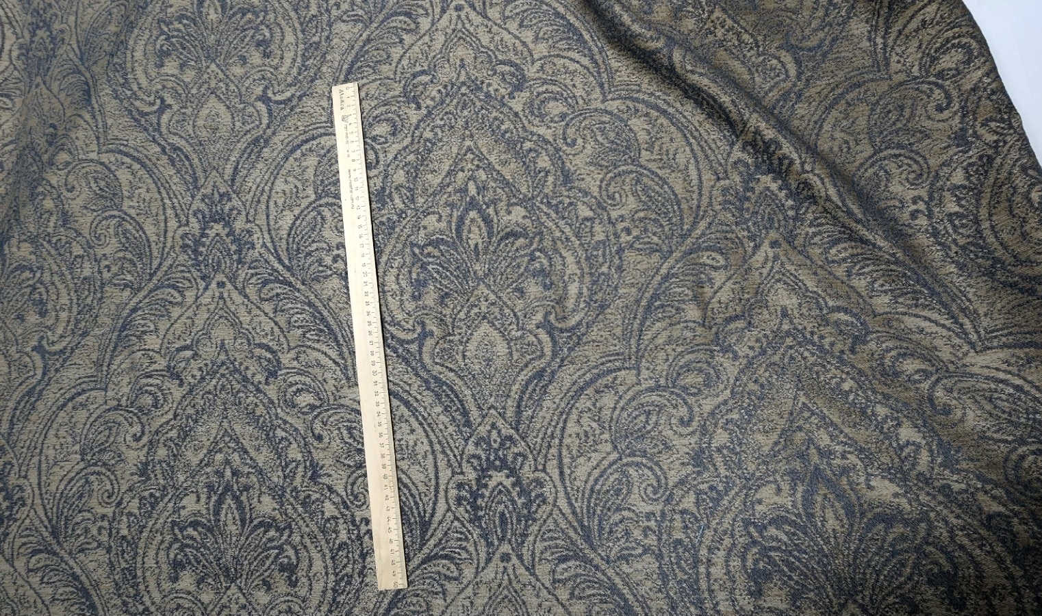 Портьерная ткань с крупными рисунком и 20% натуральной шерстью в составе. Пластичная, мягкая, хорошо драпируется в складках. Бежевый фон с коричнево- рыжеватыми нитями, особенно заметными при попадании солнечного света или теплого света от люстры, и черными контурами рисунка с одной стороны и обратной инверсией цветов на изнанке дает возможность использовать материал с любой стороны. Ткань можно стирать при температуре 30 градусов и гладить при деликатном режиме.