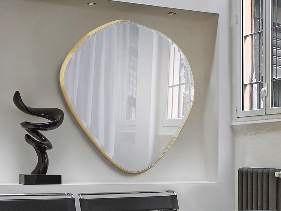 Большое зеркало 110 см с ассиметричной рамой из коллекции Mimo Schuller. Зеркальное полотно с фацетом повторяет контур рамы из МДФ с эффектной отделкой золотой фольгой. Именно благодаря её фактуре эта модель стильно смотрится в различных по стилистике помещениях. Глубина зеркала 4 см.