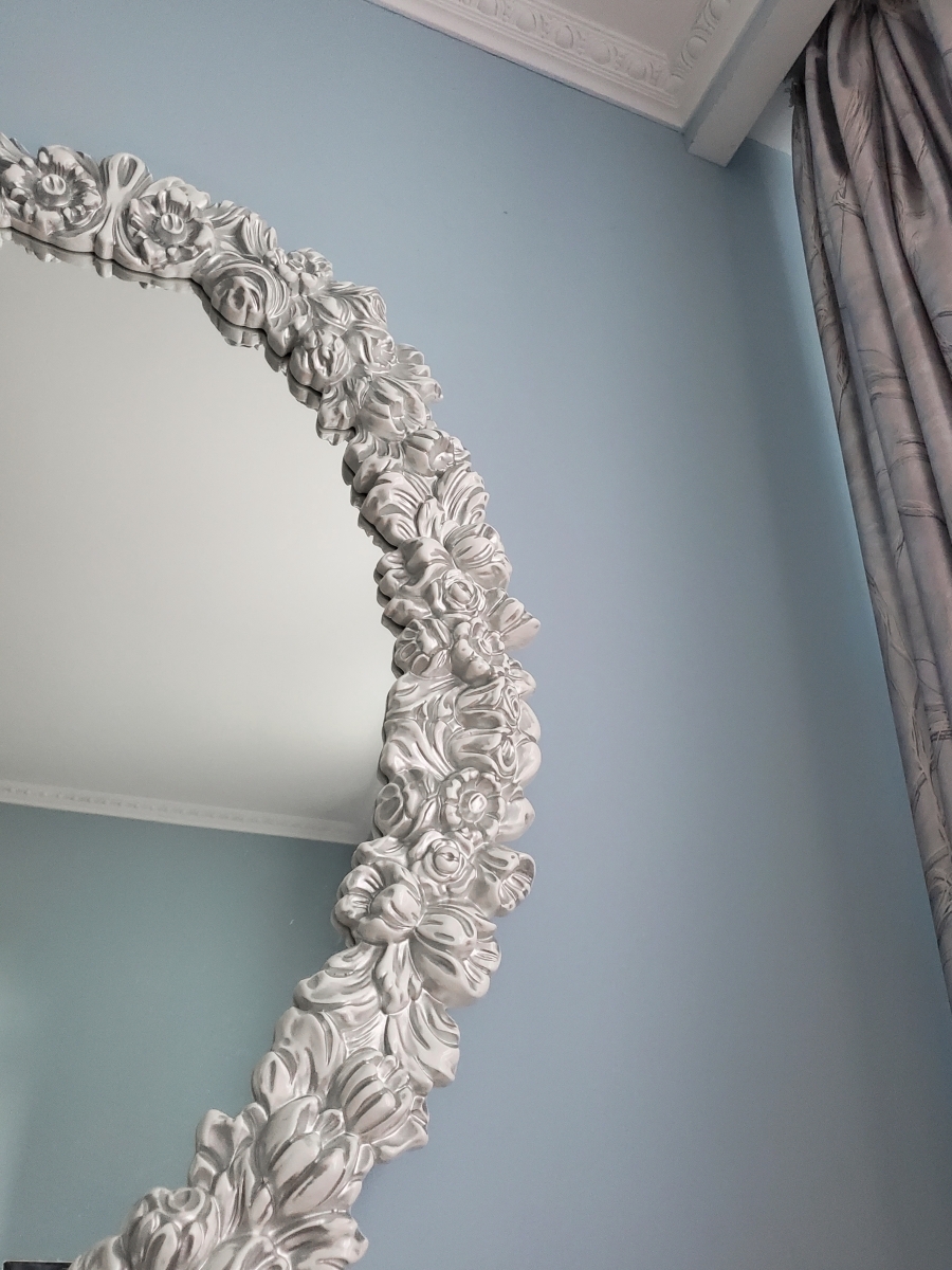 Нежное изысканное овальное зеркало в белой раме из цветов и распускающихся бутонов с серебристыми прокрасами лепестков станет украшением интерьера классической гостиной, прихожей, ванной или комнаты девушки. Универсальное сочетание белого и серебра подходит под любой цвет стен и окружающего пространства. Размер зеркала 74 на 94 см. При желании можно его повесить вертикально либо горизонтально. Если в интерьер нужен другой цвет рамы, его также можно заказать. Срок изготовления 21 рабочий день.