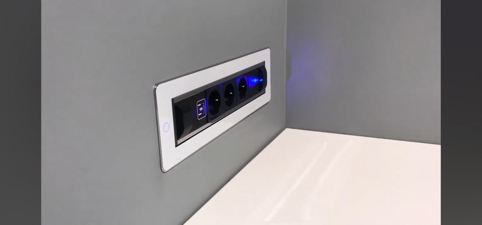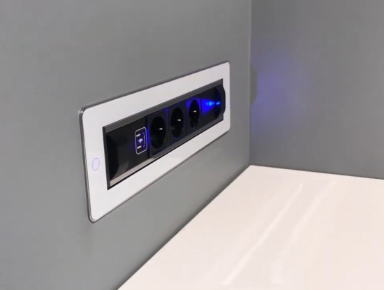 Стильный поворотный модуль встраиваемых в мебель розеток с крышкой VersaTurn 3.0 оснащен двигателем, который поворачивается на 180°, от итальянской фабрики ASA Plactici. Он включает: 3 розетки + 2 USB-зарядки Type A+C. Блок утанавливается в горизонтальной либо вертикальной плоскости. Прекрасно подходит для рабочих поверхностей в квартире, столов для совещаний в престижных офисах. Ударопрочный дизайн. В отделке используется белое закаленное стекло и нержавеющая сталь, а также удобная световая индикация кнопки включения/выключения. Легкое касание, и происходит запуск поворотного механизма. Размеры, мм: 390х112х107,7.