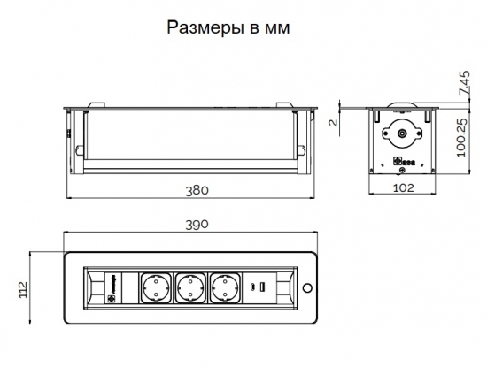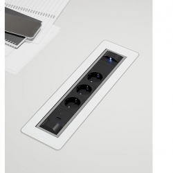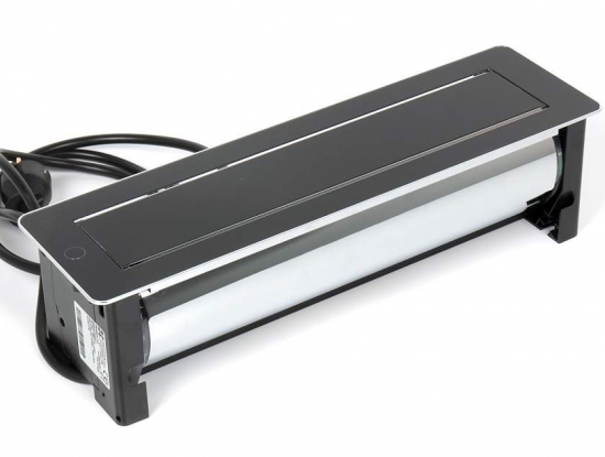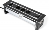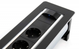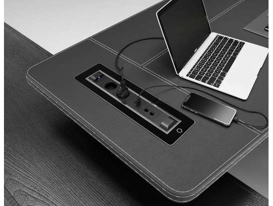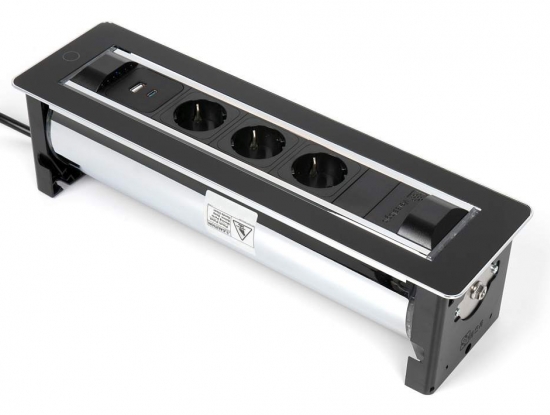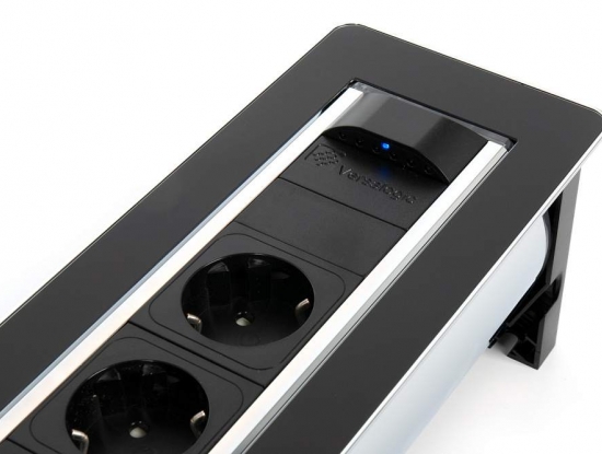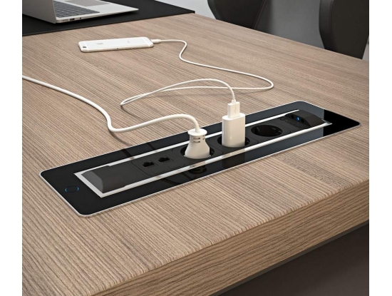 Черный поворотный модуль VersaTurn 3.0 с крышкой у встраиваемых розеток оснащен двигателем, который поворачивается на 180°, от итальянской фабрики ASA Plactici. Он включает: 3 розетки + 2 USB-зарядки Type A+C. Прекрасно подходит для рабочих столов в современной квартире, столов для совещаний в престижных офисах. Ударопрочный дизайн. В отделке используется черное закаленное стекло и нержавеющая сталь, а также удобная световая индикация кнопки включения/выключения. Размеры, мм: 390х112х107,7.