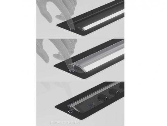 Блок управляется сенсорным датчиком с электрической системой открывания/закрывания. Лазерная система обеспечивает максимальную безопасность, блокируя поворот модуля в закрытое положение при наличии вилок в розетках или иных внешних препятствий, таких как пальцы ребенка или другие предметы.